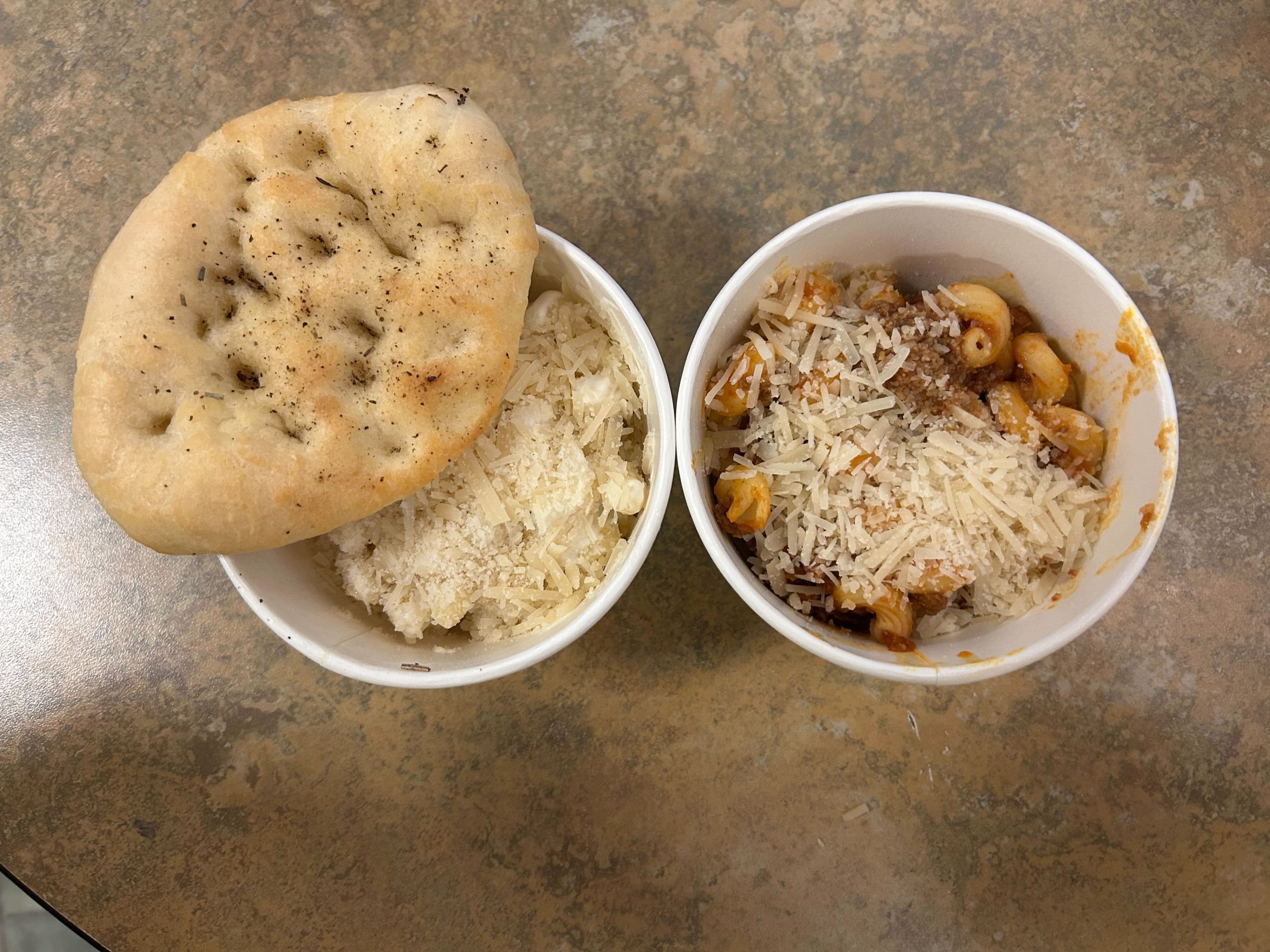 Malea Nadeo: Cavatappi Alfredo With Cheese, Cavatappi Bolognese With Cheese, & A Slic Of Focaccia