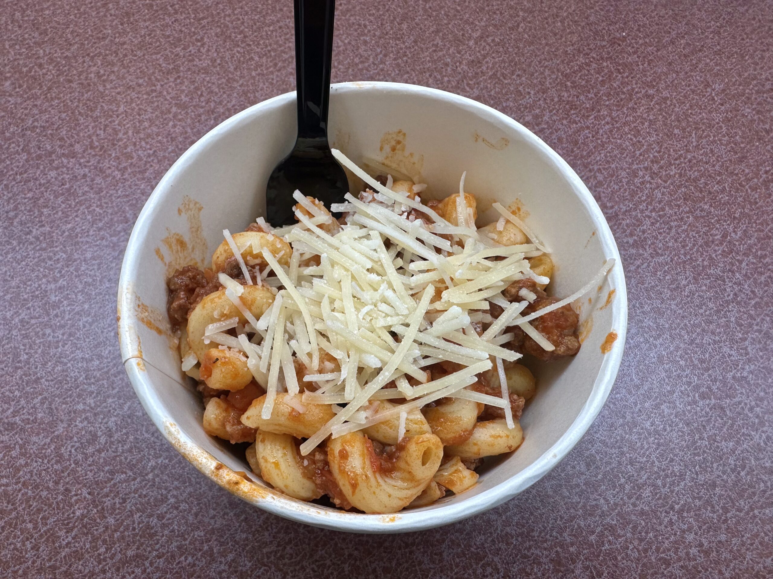 As you walk through the line, you can choose from proteins, toppings, and sides. I settled on two choices: the cavatappi Alfredo, cavatappi bolognese, and an additional slice of focaccia. First, I started with the bolognese. It really just tasted like a traditional meat sauce. Nothing too special, but I appreciate the effort.