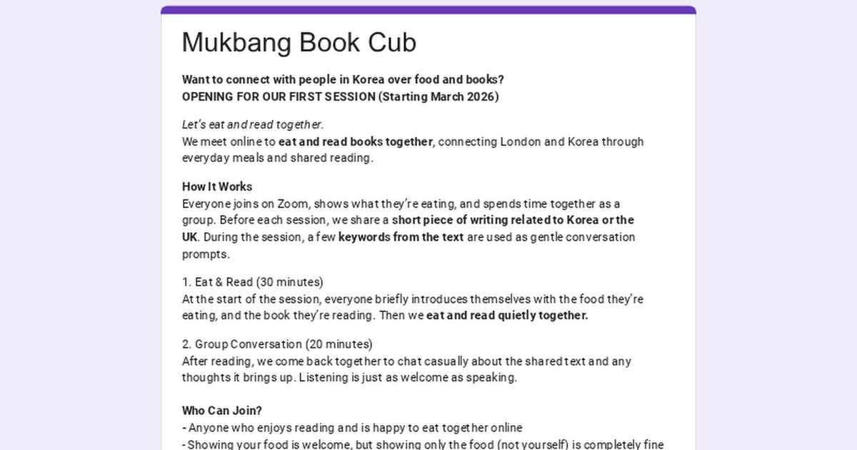 Anyone who has visited Korea, is planning a trip, or simply wants to have deeper conversations with Korean people is always welcome. This isn’t a language class—we’ll be sharing food, reading books together, and talking freely in a relaxed setting.