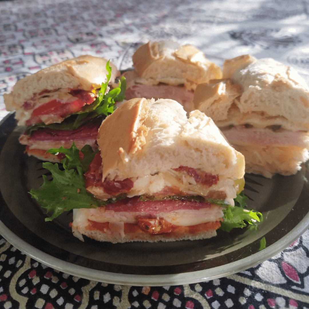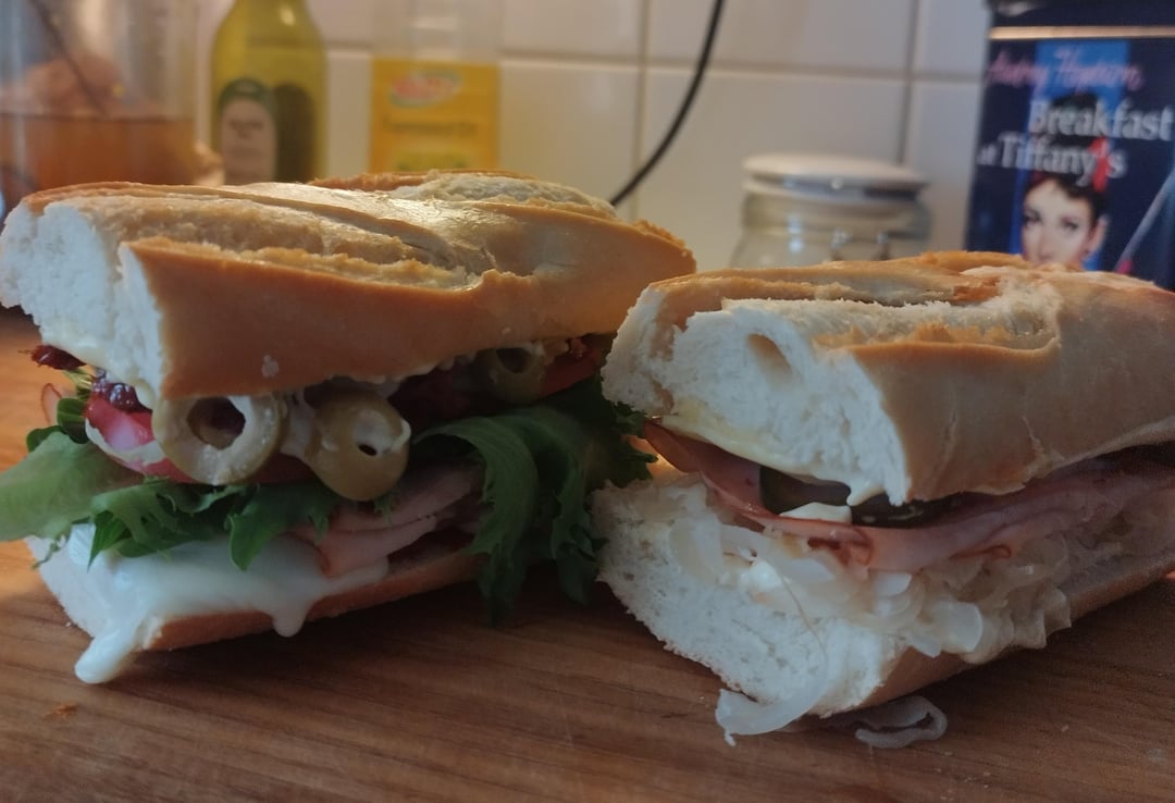 Couldn't decide so I made one italian style with pesto arrabiata, scamorza cheese, salami, turkey, olives, onions, tomatoes (both sun dried and not), balsamic syrup, lettuce and one with ham, gouda, sauerkraut, horseradish and pickled jalapenos.