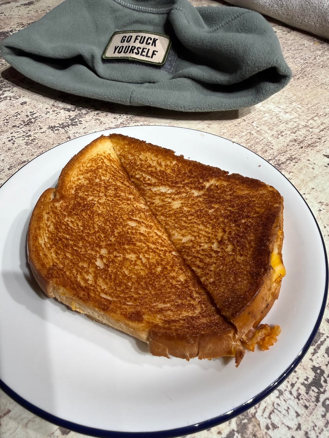 Good cheese, good looking sandwich and hilarious beanie