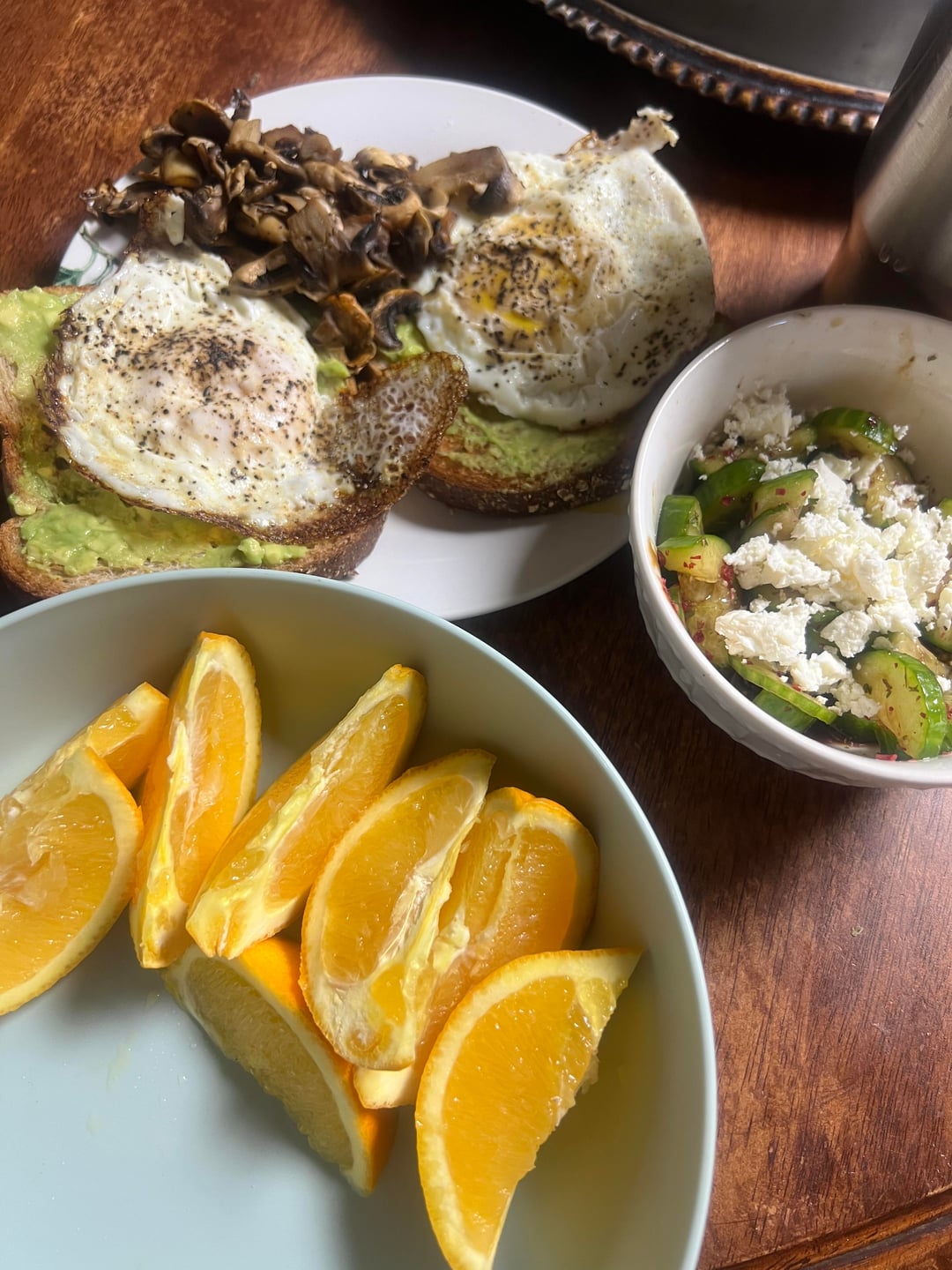 My daily breakfast that keeps me full until 6 pm. I always have to have half an avocado on 2 40 cal toast and 2 fried eggs in 1 tsp olive oil with garlic powder and salt and then 2 cups steamed cabbage seasoned with mushroom powder and garlic powder oregano and 2 tbs mozzarella cheese and then any 2 fruit I have available and 2 veggies cooked or raw