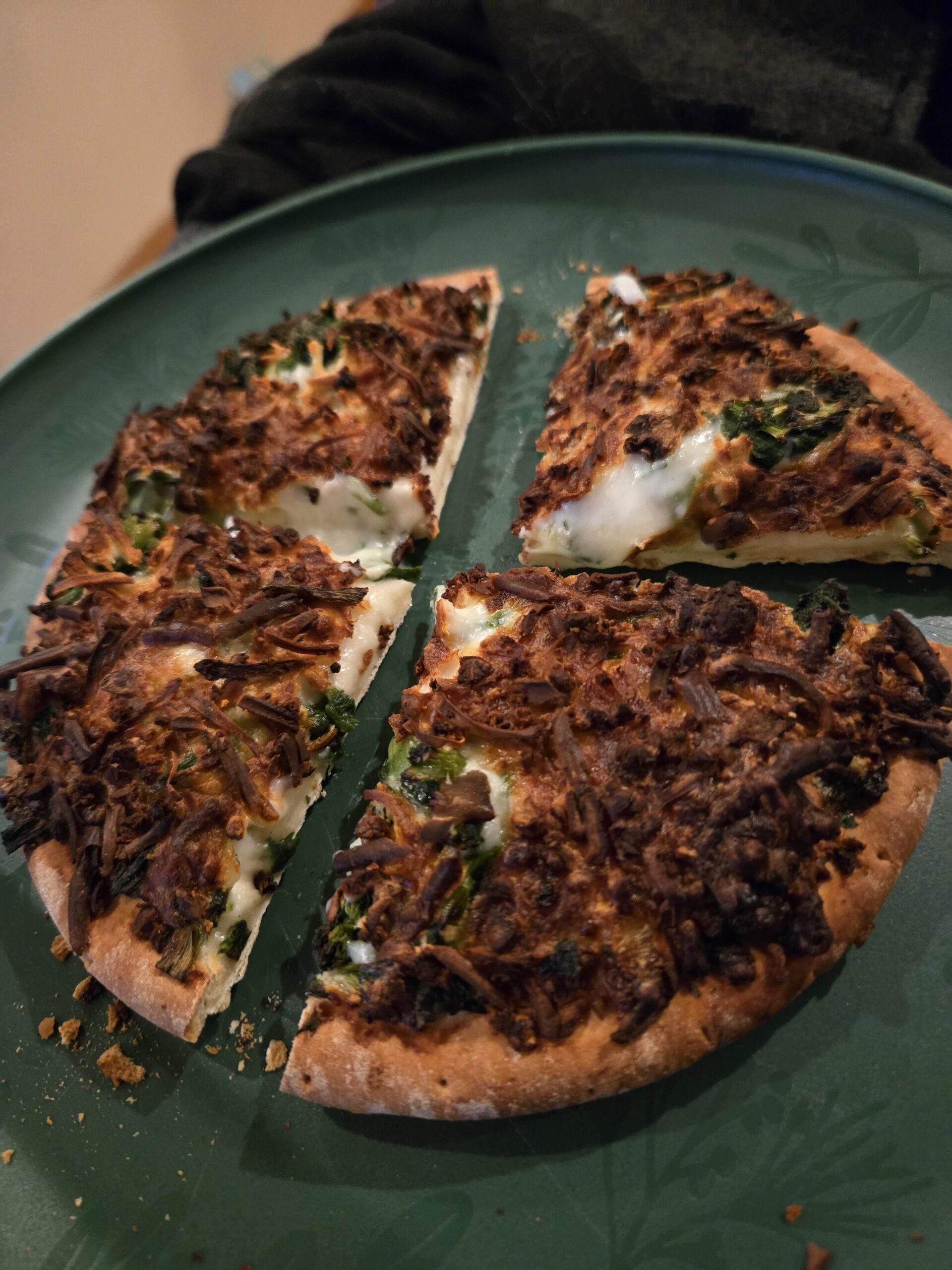 Aside from clearly being overcooked it looks fine. Spinach or broccoli? I love a white sauce pizza too. It won’t win any awards but I have to say not guilty.