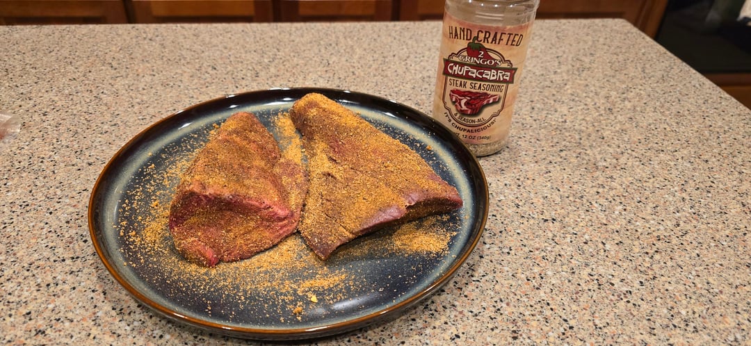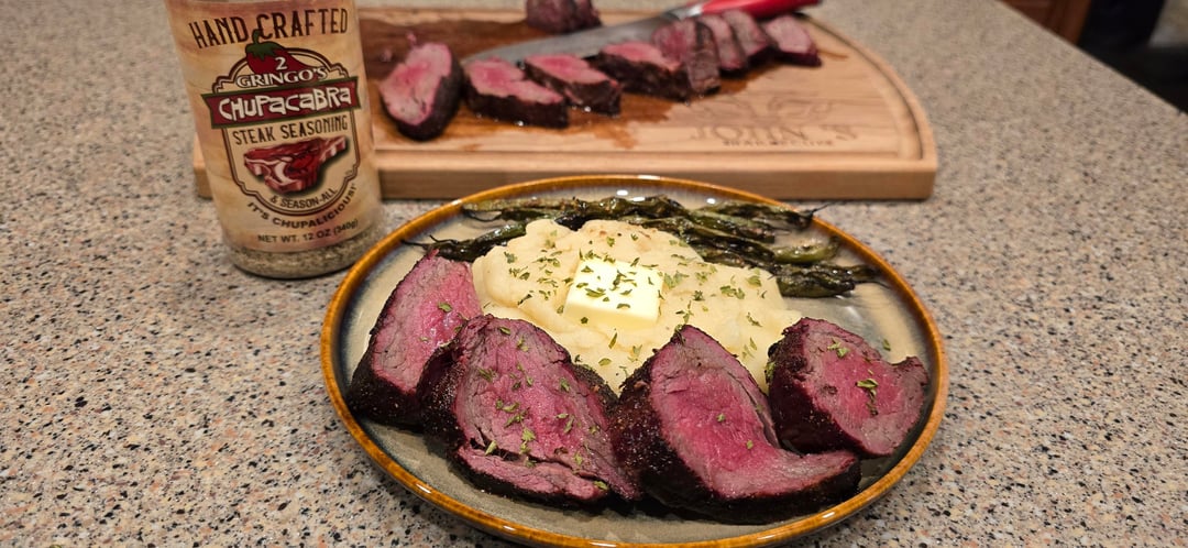 These were seasoned and then dry brined with 2 Gringos Chupacabra Steak Seasoning, smoked over mesquite then reverse seared. Served with smoked fresh snap beans and parmesan and white truffle mashed potatoes.