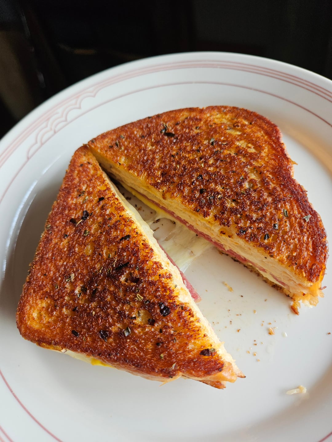 With havarti, muenster, champagne dijon and regular yellow mustard inside.