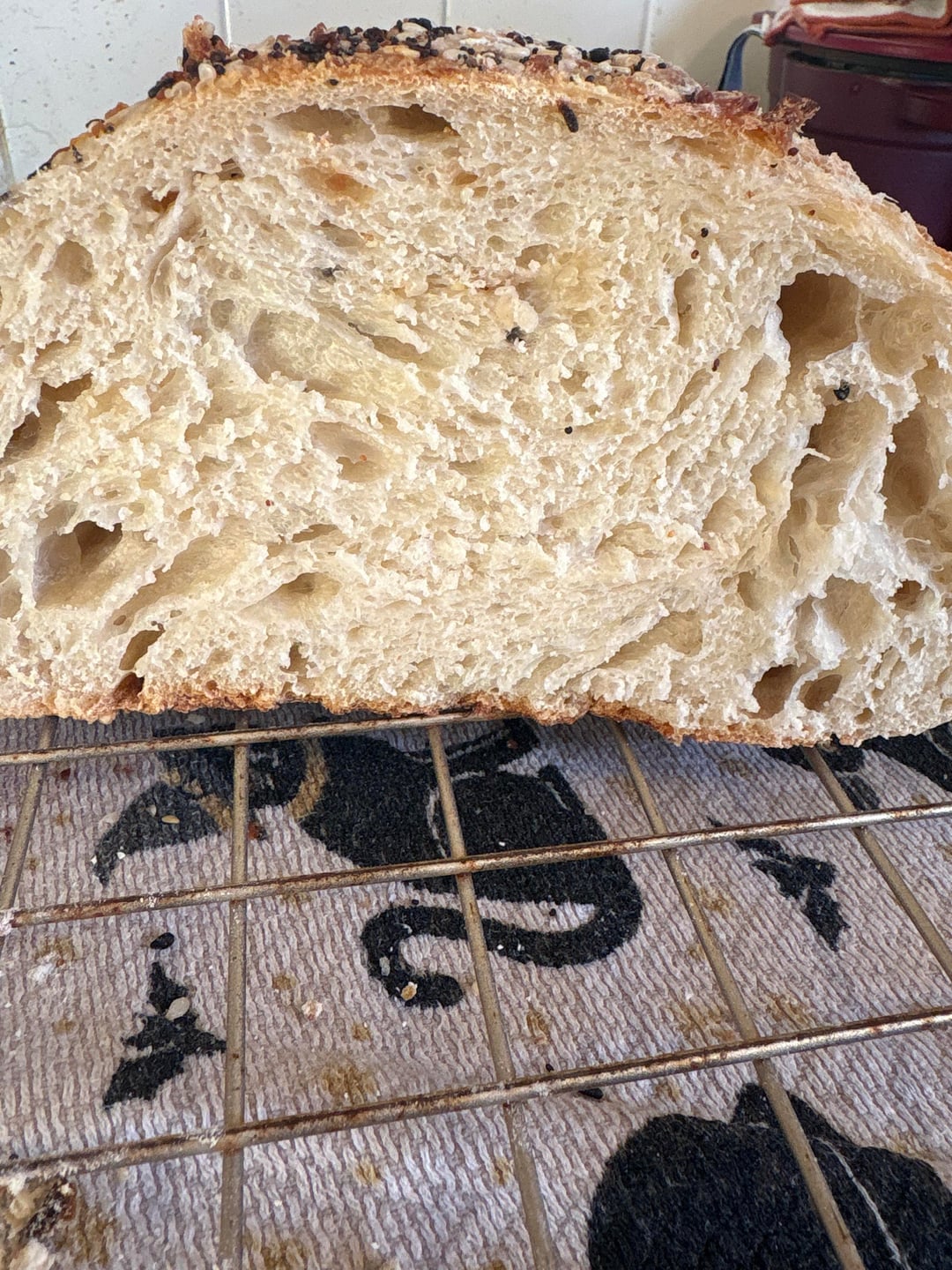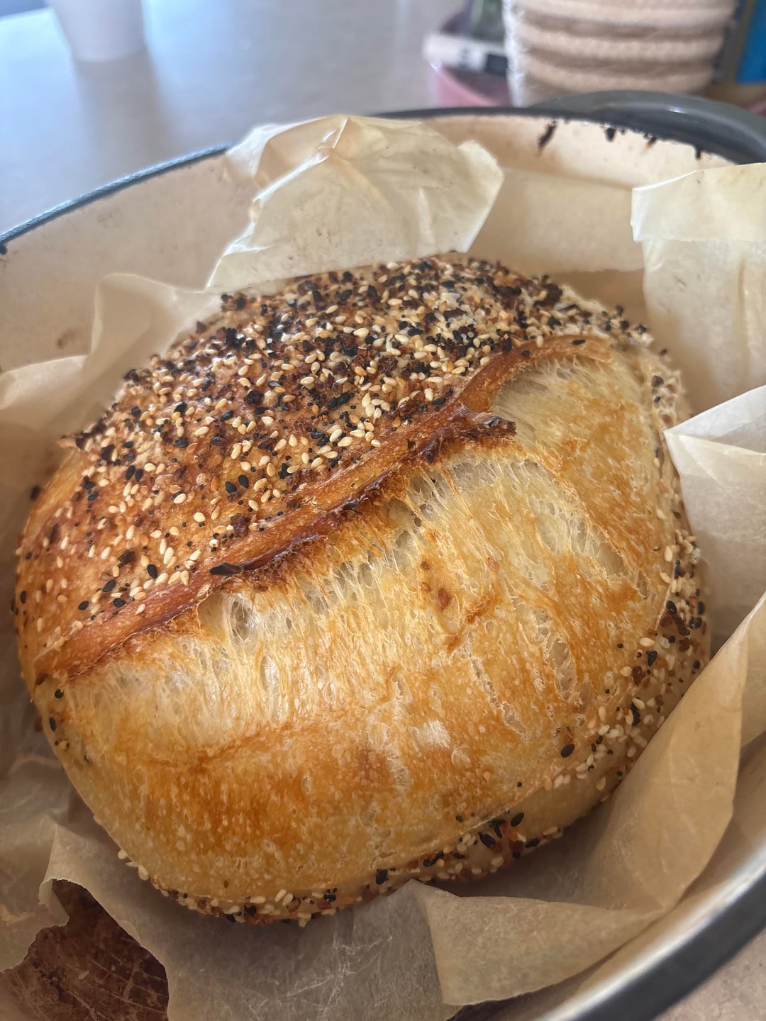 • The next morning, preheat a Dutch oven or baking vessel in a 450d oven. Score your dough and add to your baking vessel into the oven with the lid on. After 20 minutes, remove the lid and bake another 20 minutes.