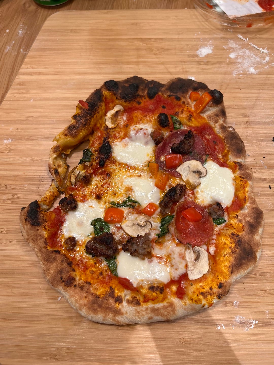 mozzarella, marinara, about 150g of dough, pepperoni, salami, mushrooms, basil, and italian sausage about 10in?by raccooneater6000 Dining and Cooking