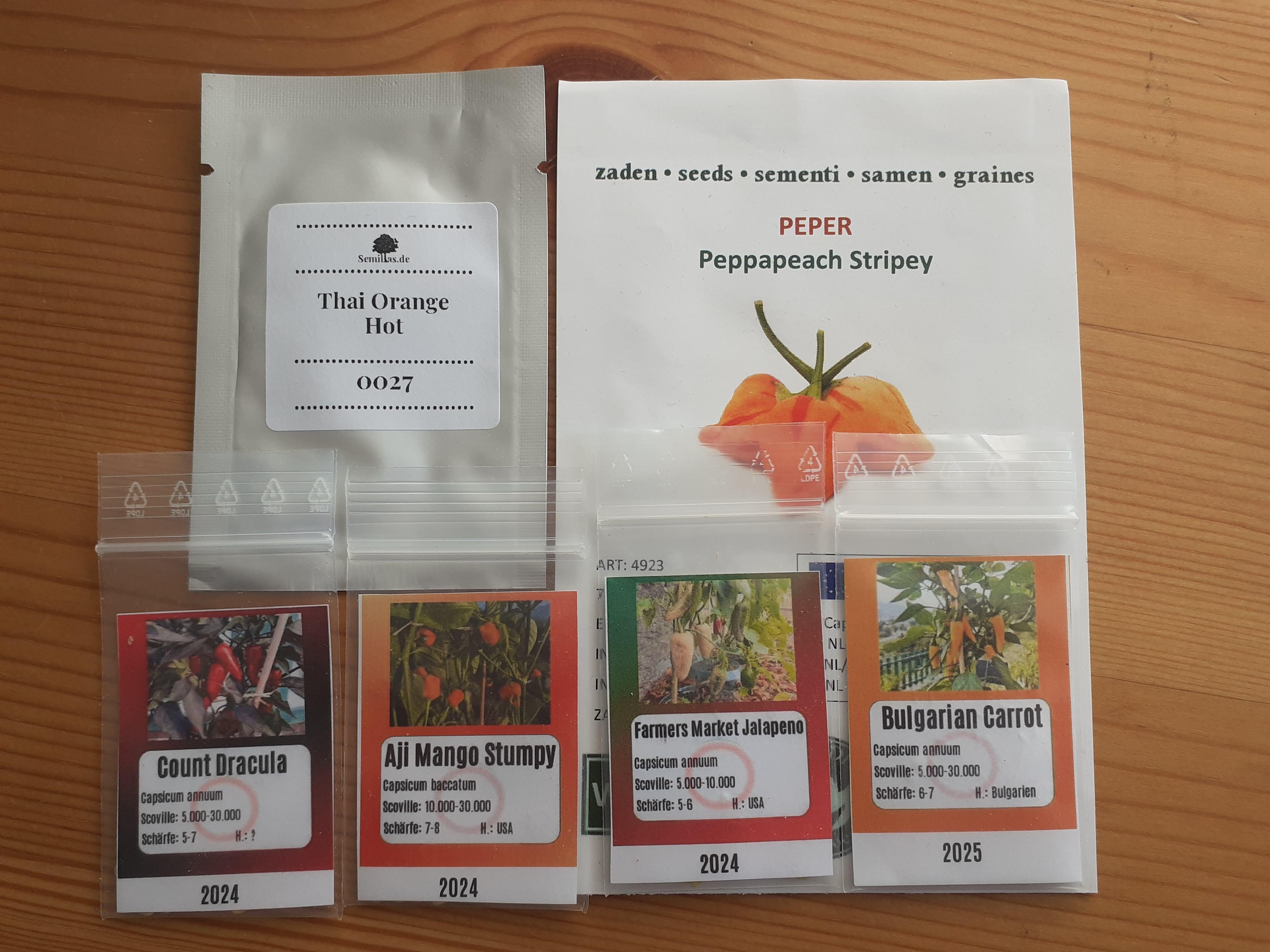 Golden cali wonder, Ancient sweets, Lunchbox, Orange cayenne, Beaver Dam pepper, Jalapeño, and Apocalypse scorpion