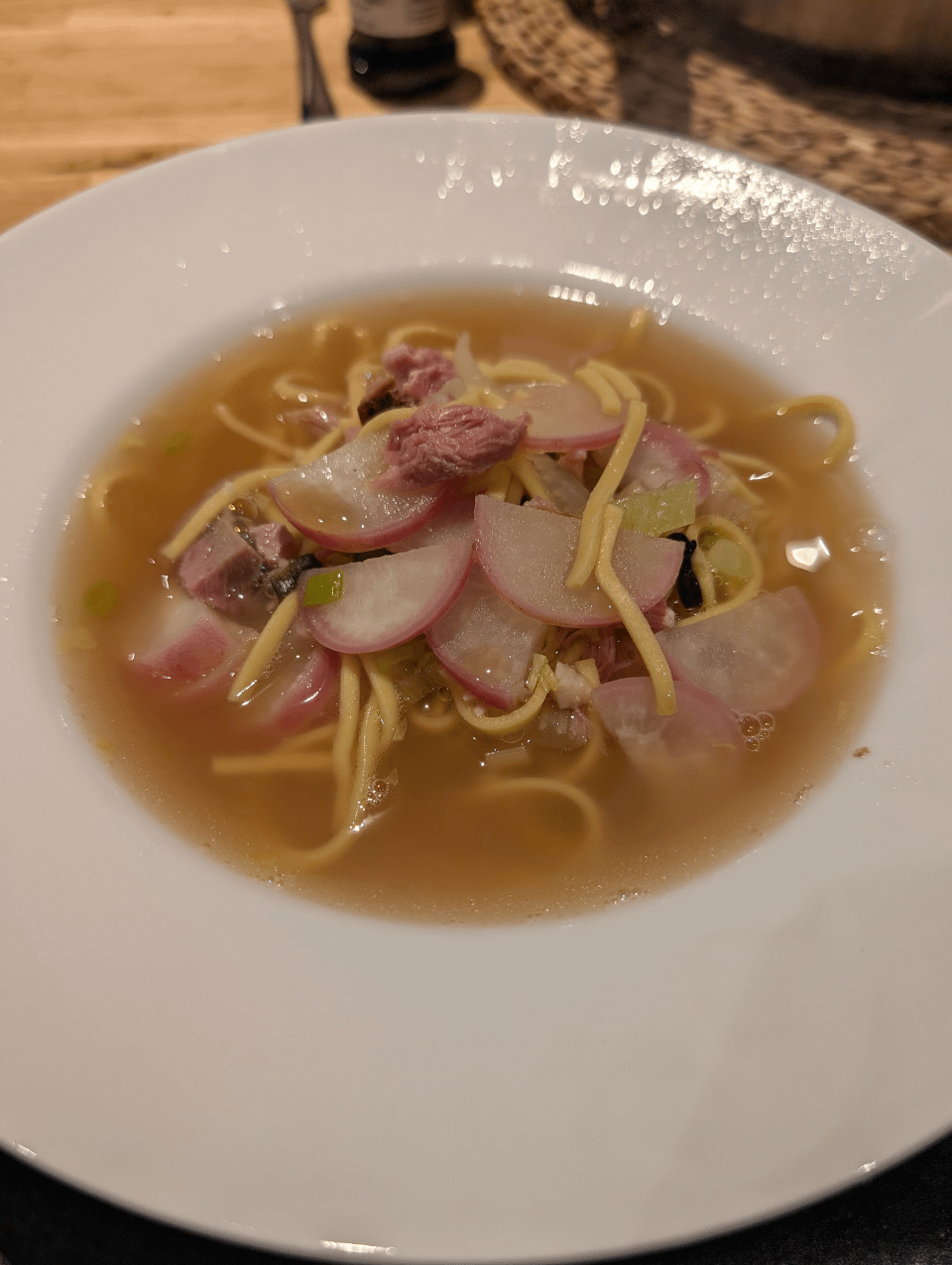 Ham and radish soup with noodles. Using the Xmas ham bone for a stock, the last of the ham, and some radishes that were in the discount section at Morrisons. Ginger, garlic and celery. It was very nice if I do say so myself.