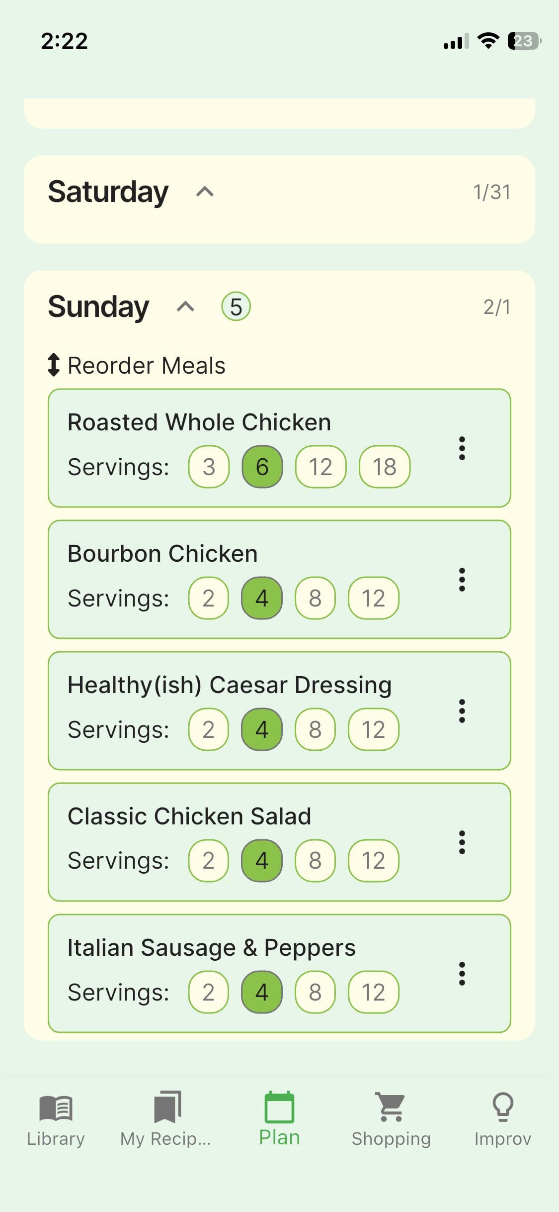 Planning to use the whole roasted chicken for the chicken salad and for a chicken Caesar salad. Gonna make a batch of the bourbon chicken for weekday lunches. Italian sausage and peppers will be for subs and maybe one night on a pizza.