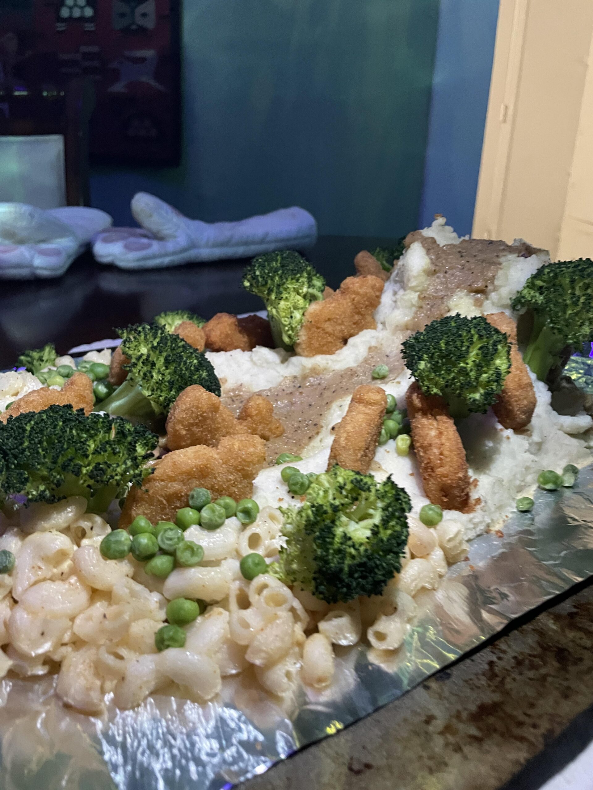 Mashed potato volcano with gravy lava, Dino nuggets, and broccoli trees. Preceded by a bunch of Seagram’s gin