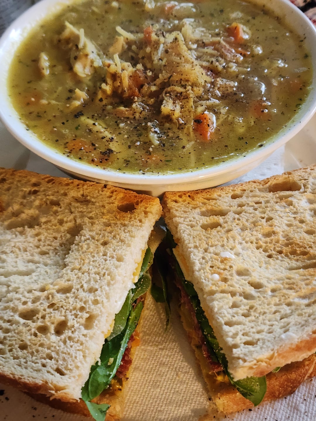 The soup is a modified dry pack of lipton chicken noodle. Yesterday I cooked down onions, celery, carrot, garlic and spices of tumeric, basil, oregano, and bay leaf. I made the base to add to the packs. I also added leftover rotisserie chicken to it. It’s kinda fully loaded