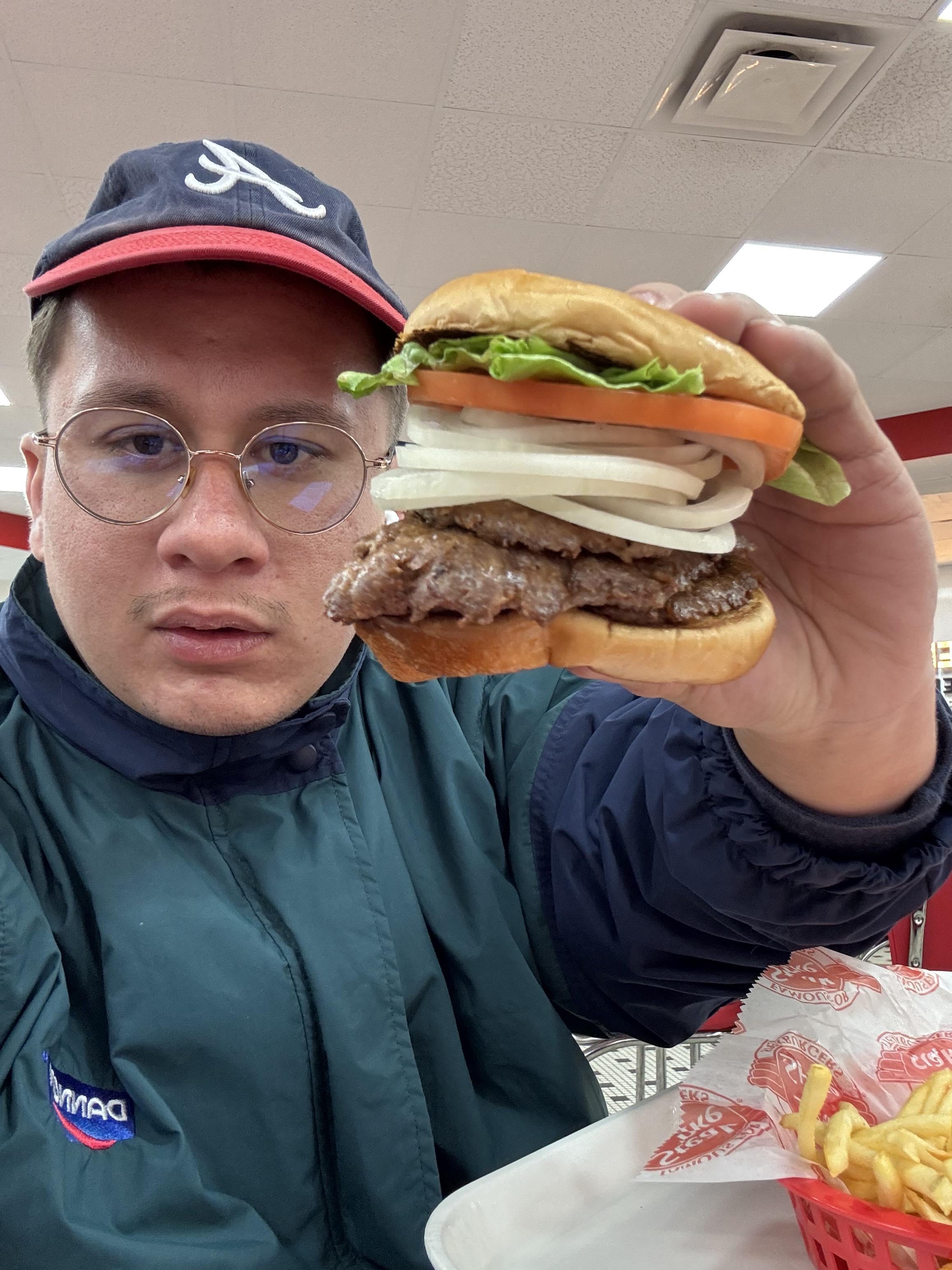 The contours & proportions of your face somehow match the oniony burger you’re holding & its making me lol