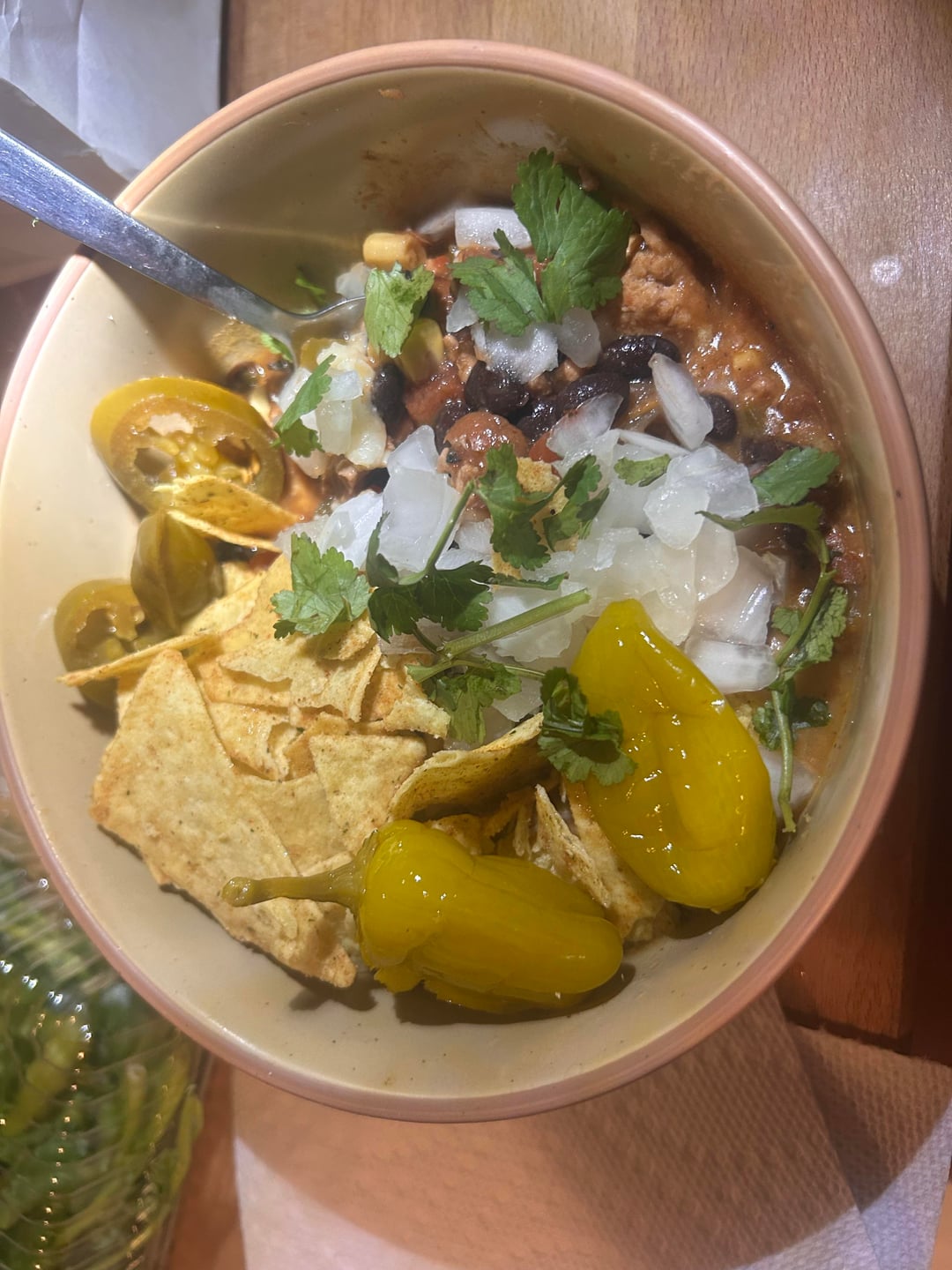 Diner was a turkey and bean chili topped with Quest protein chips, raw onions, jalapeños, pepperoncini and cilantro