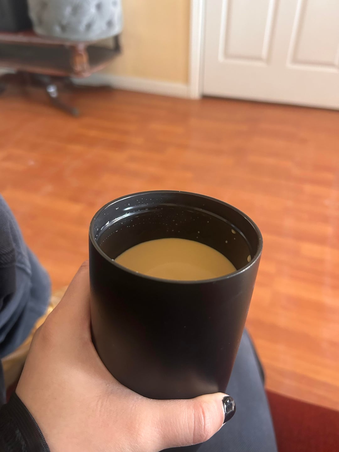 With a coffee with cream and Splenda