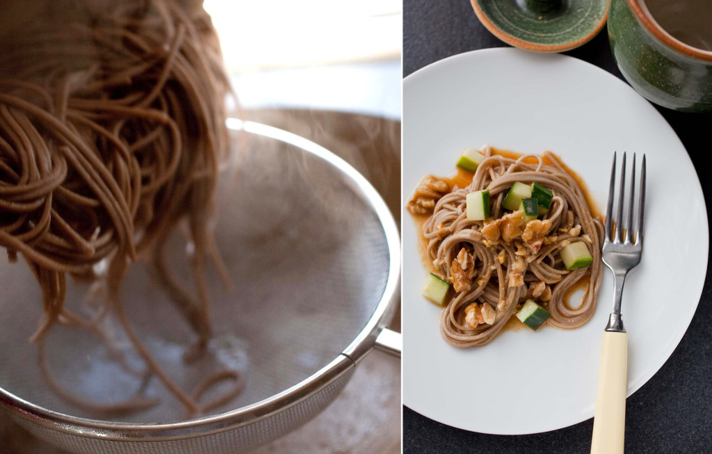 I find any combination of noodles and hot-and-sour dressing fairly addictive, and none more than these earthy buckwheat noodles. You can make a meal of this salad if you add a little protein in the form of tofu, shredded chicken or shrimp.