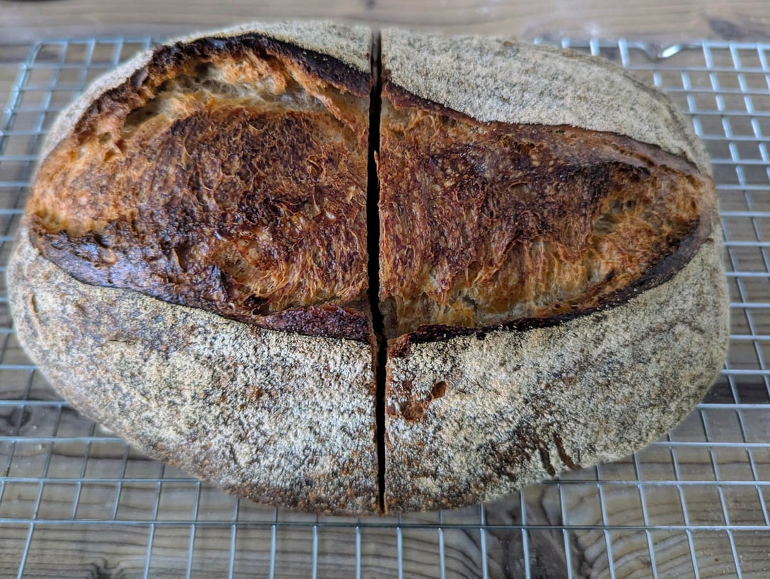 First time I tried to use whole grain rye instaed of wheat to get some more sourness. Truned out well. Also I tried to do this with my "bread baking function" from my steam oven instead of a dutch oven. Turned uot pretty well, I musst say it gets a lot glossier without the dutch oven.