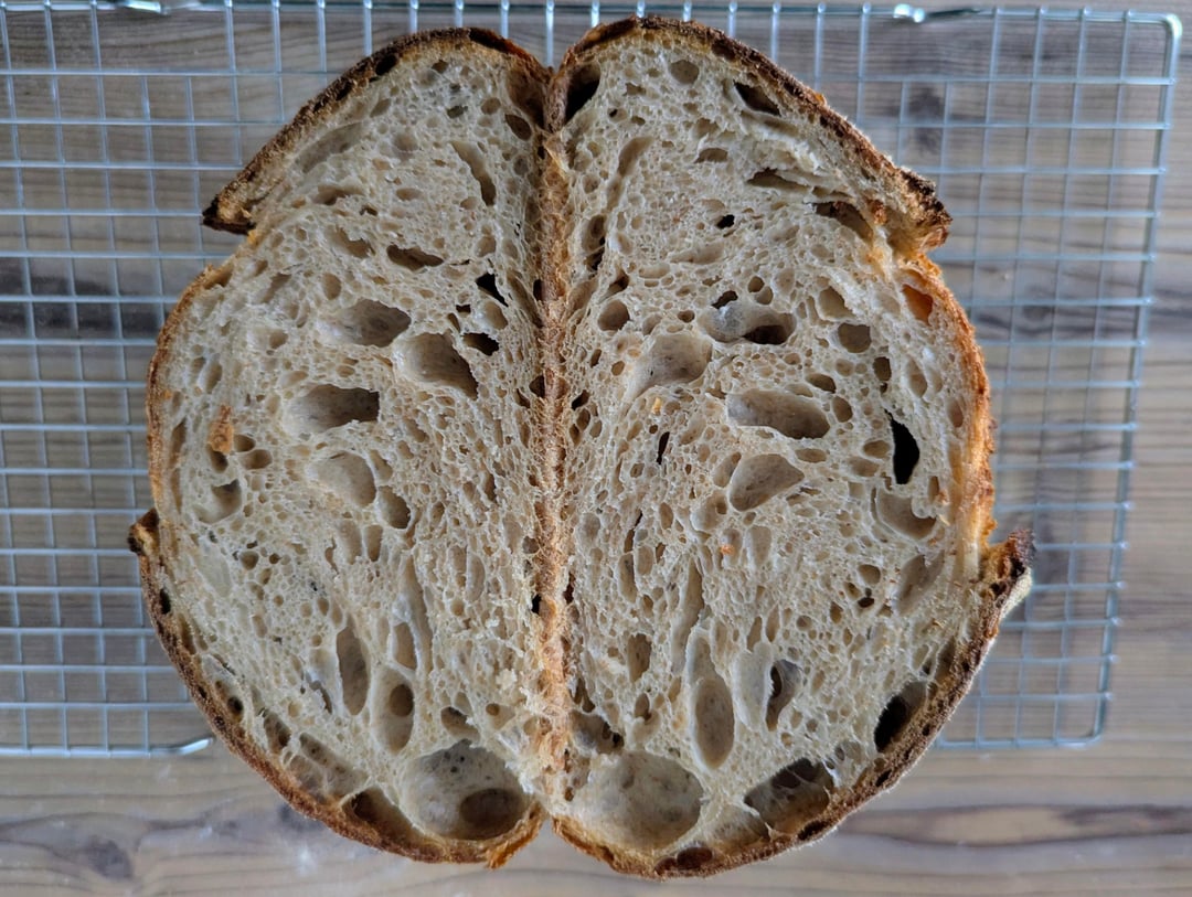 Made two loafs like this, one with room temperature proof and one is still in the fridge, curious how they (and if) they will differ in terms of looks, spring and taste.