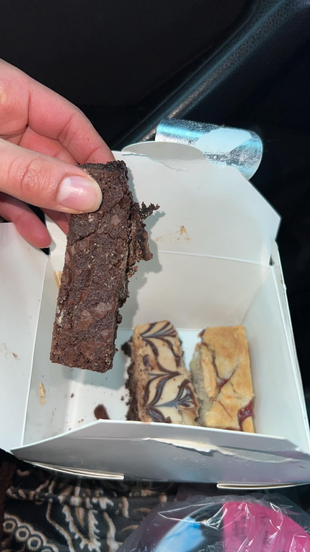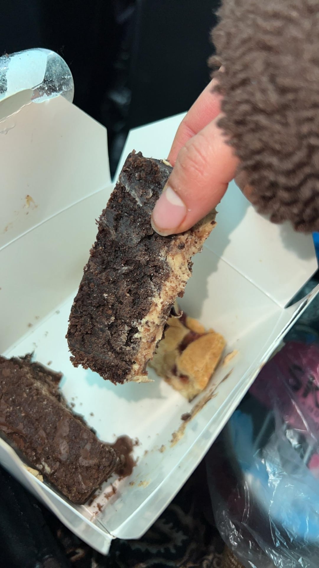 I had 3 brownies. I had a 1/3 of a chocolate orange brownie, 1/3 of a kinder brownie which was normal brownie with hazelnut spread on top and also 1/3 of a Jammie dodger blondie. Essentially totalling a full brownie. Pics 2/3 show the height of them too.