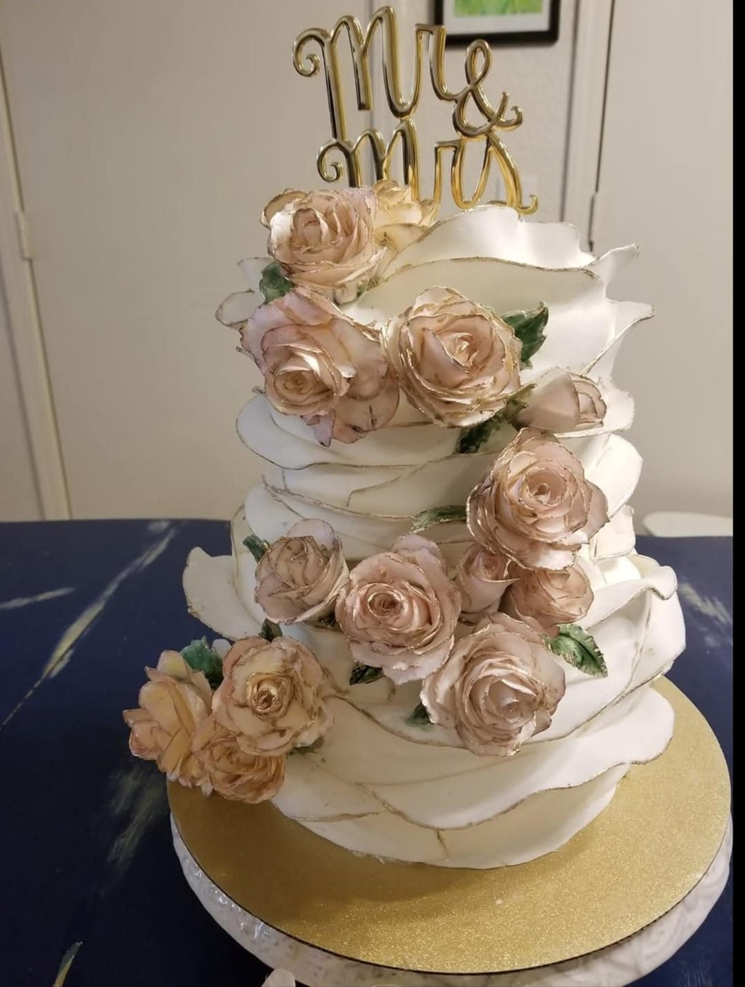 I made this wedding cake for a January 1st wedding. The ruffles are fondant. My favorite part of decorating is making the flowers by hand. I don't use molds for my roses. I make them using a blend of fondant and gumpaste. It is very time-consuming, but I also find it so relaxing.