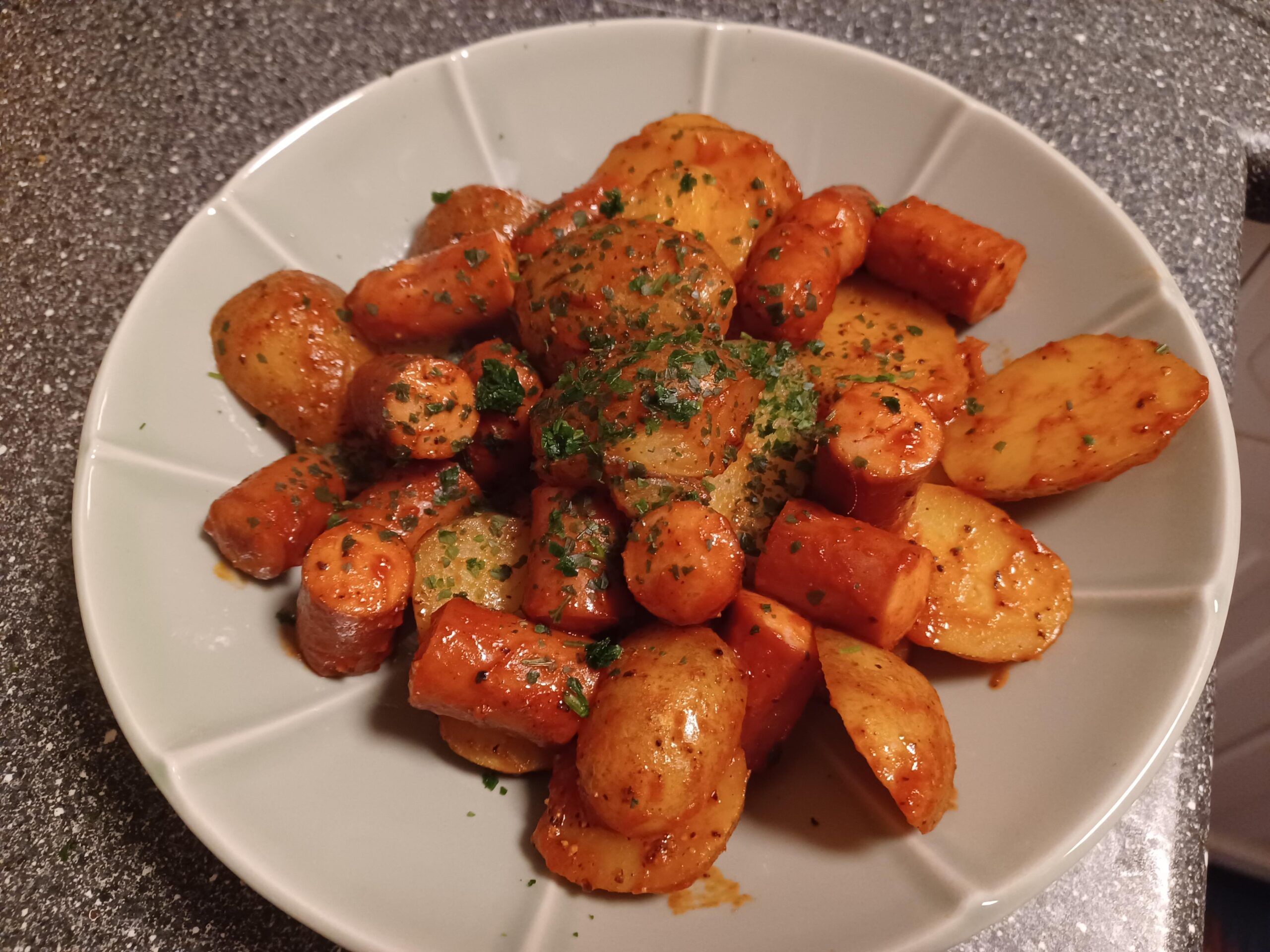 The origin of the dish is along the lines of: "You're on holiday, staying at a remote Swedish ødegård. The only food you have is a pack of sausages and a bag of potatoes. You find a bottle of ketchup in a cupboard. With these ingredients you make a dish."
