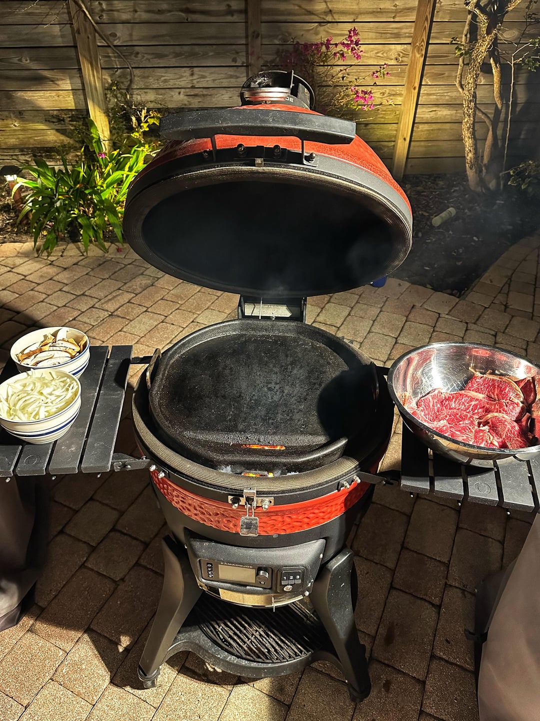 Thin sliced wagyu NY strip, shiitake mushrooms, sweet onions, cheddar and horseradish sauce on toasted French bread. Really tasty.by EmbersOnlyBBQ Dining and Cooking