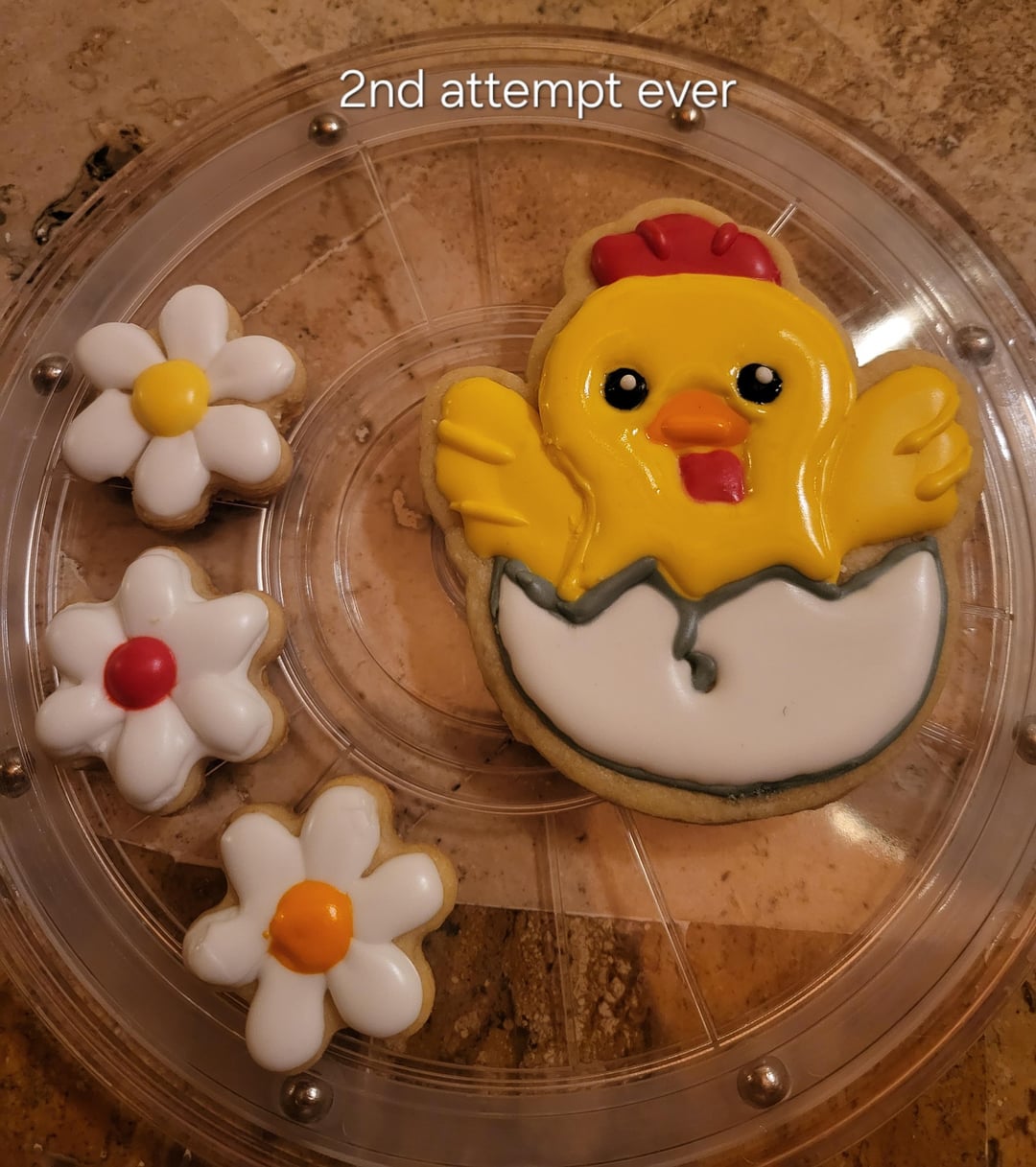 I think my base icing came out pretty well. I separated some into 5 bowls and used Chefmaster Liqua-gel food color. I added water a few drops at a time until I thought I had flood consistency, then filled up the tipless bags and started practicing on this chick design. My granddaughter turns 5 mid-February and requested a chicken birthday. "This Chick is Five!" is the theme. 🐣 (I have chickens at my house, so I am doing my part to create a future Crazy Chicken Lady.😂)