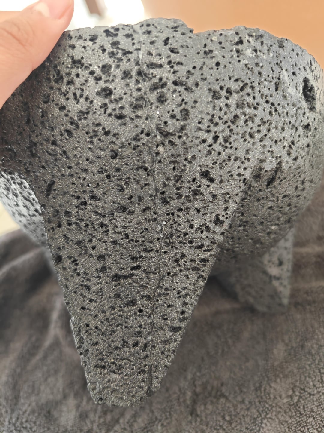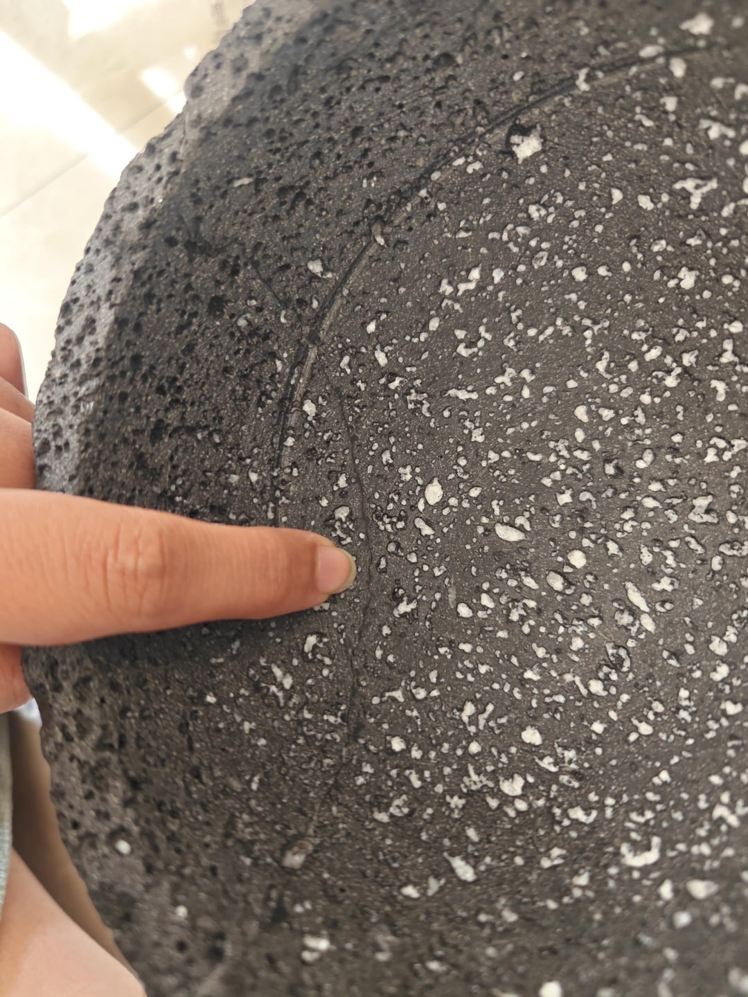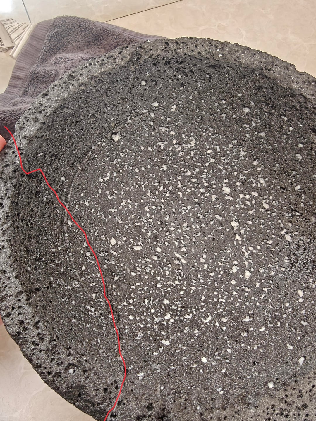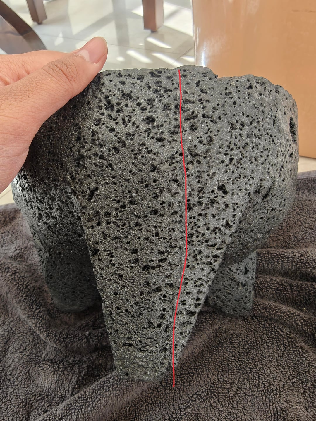 I just bought this molcajete and did one round of curing and I noticed a visible line running inside the bowl and down one of the legs (last two photos are marked in red).