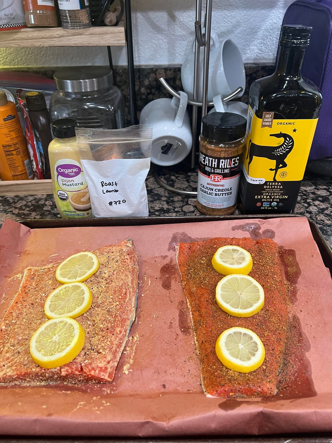 Dijon mustard binder, Whole spice inc. lamb rub seasoning and SPG.