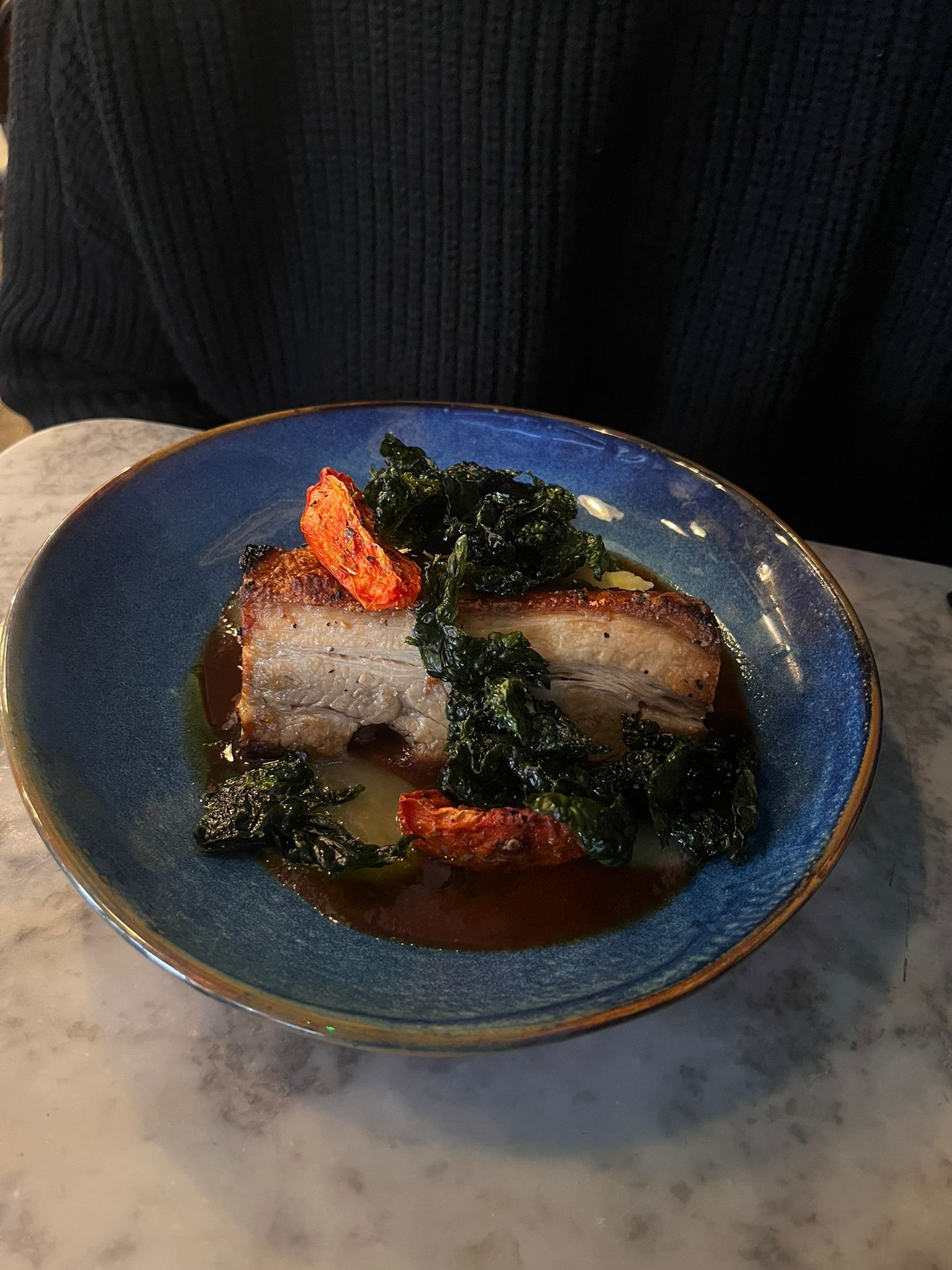 The slow-roast pork belly with apple puree, black cabbage and sun dried tomatoes.