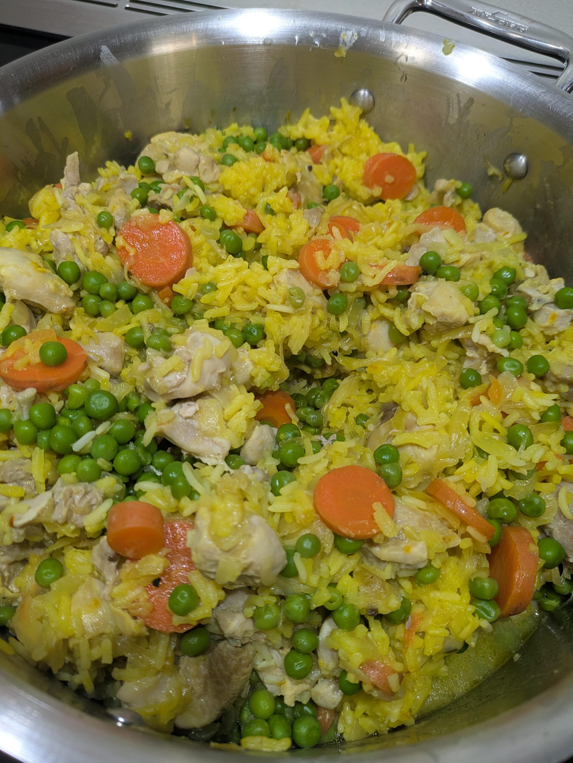 * Sprinkle with 1 tsp kosher salt (1/2 tsp table salt): 2 lbs (1 kg) boneless chicken thighs * Put a large pot on medium heat and add 2 Tbsp butter or vegetable oil * Cut 3 large or 4 medium carrots into 3-5mm slices and add to pot * Dice 1 large or 2 medium onions and add to pot with 1 tsp kosher salt * Stir veggies occasionally and chop the chicken into large bite size (1″/2cm) pieces * When the onions are translucent, add 1 1/3 c (300 mL) dry long grain rice to the pot with 1/2 tsp freshly ground black pepper * Turn heat up to medium high and cook for a few more minutes * Grind a pinch of saffron into a coarse powder and add to the pot with 2 1/3 c. (550 mL) water, 1 packed cup of sauerkraut with brine squeezed out, and the chopped chicken * Mix everything well * Bring the pot to a boil then turn down heat to medium-low and cover * Cook 25 minutes then stir in 1 lb frozen peas and cook another 5 minutes. * Remove from heat and leave covered until it cools enough to portion into meal containers