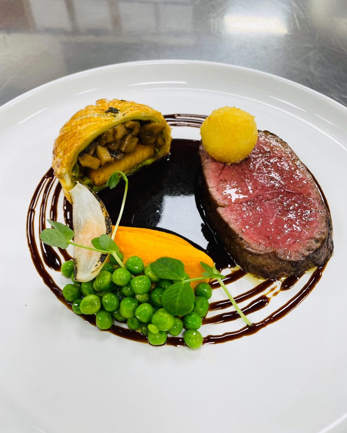 Beef tenderloin – Mushroom and rutabaga pithivier – Carrot purée – Peas – Truffle bordelaise – Crispy goat cheese.