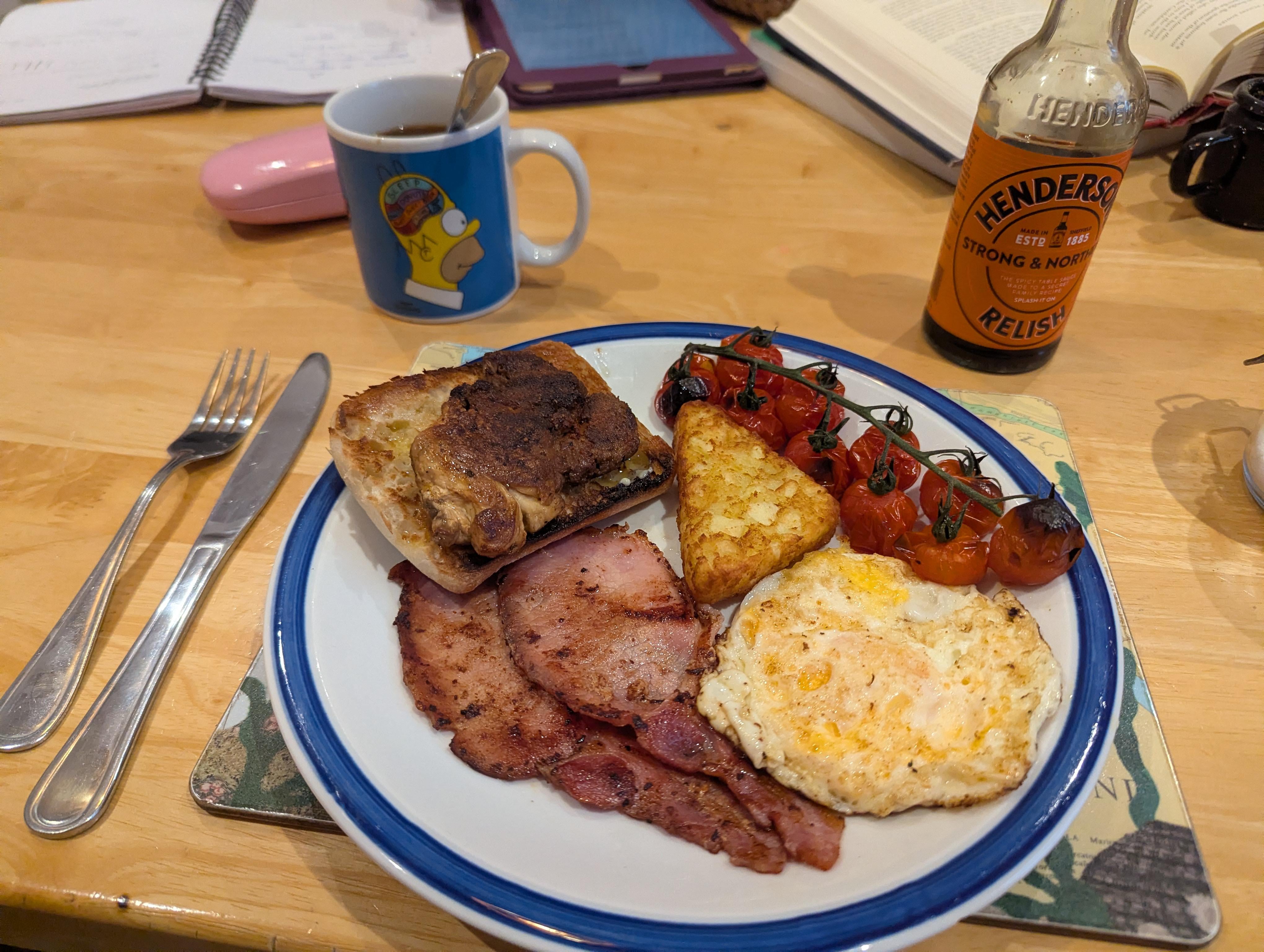 Small Cornish Breakfast : 2 * Smoked Back Bacon Sourdough Roll Lion's Mane Mushroom Hash Brown 10 Cherry Tomatoes 1 Egg Milicano Coffee in my Homer MugHenderson's because it has a subtle bit of North in itby Smart-Bank7122 Dining and Cooking