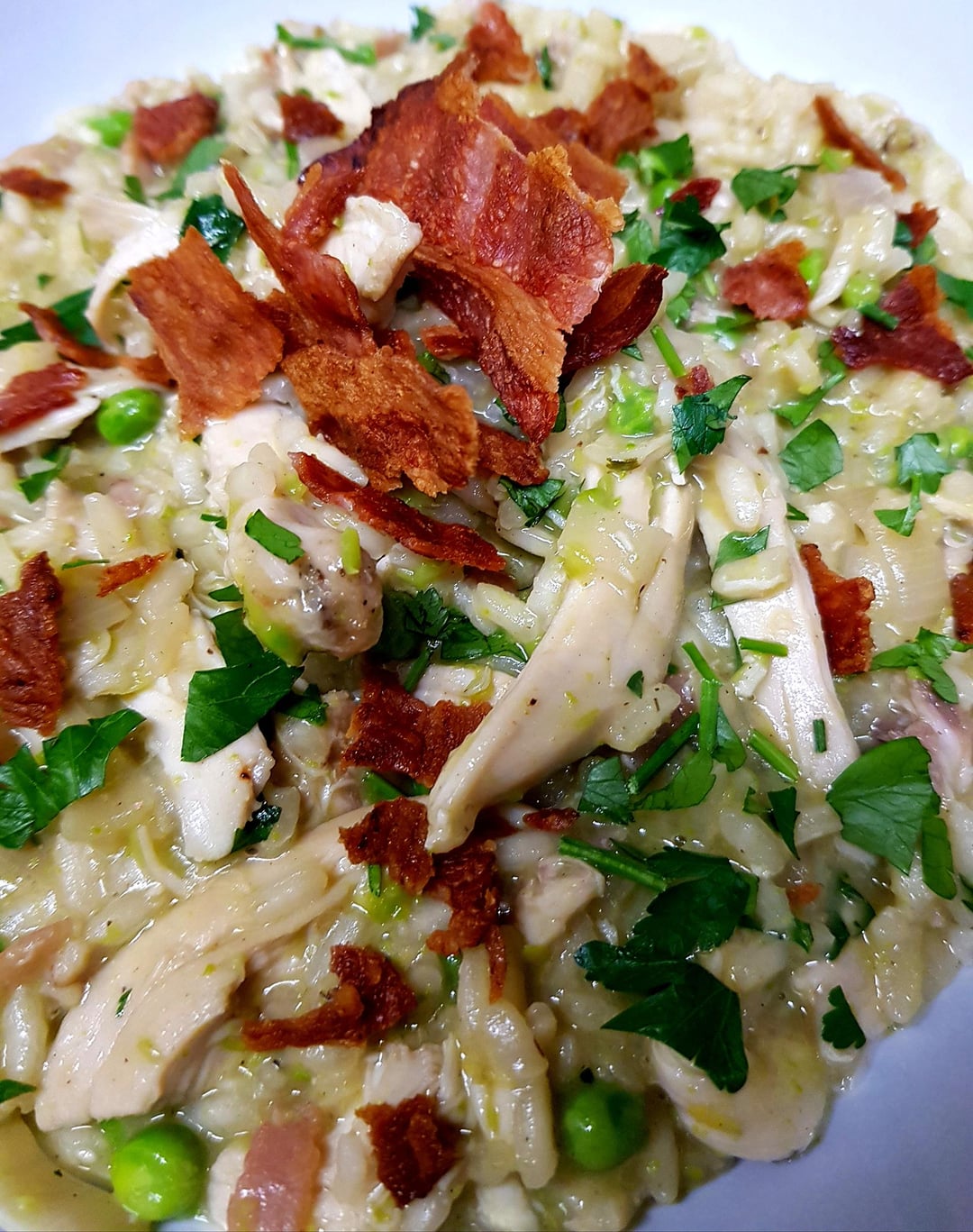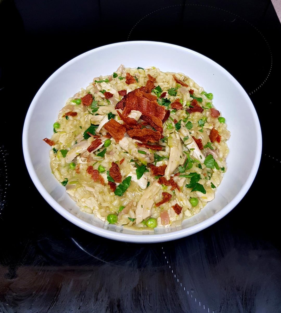 (Leftover Sunday Roast) Chicken, Crispy Smoked Bacon and Pea Risotto. Finished With Parsley and Lemon Juice.