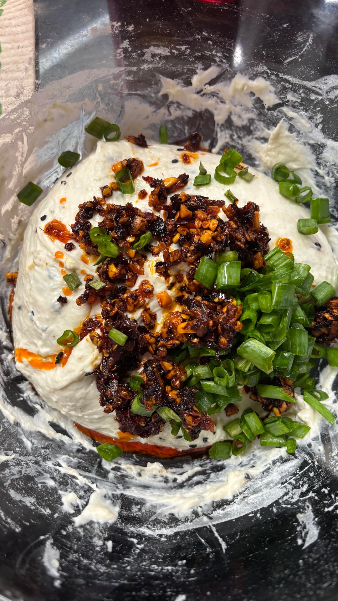 Did 2 sets of stretch and folds at half an hour intervals. After the second set, added spring onions, sesame and chilli oil and did a set of stretch and folds until it felt mixed