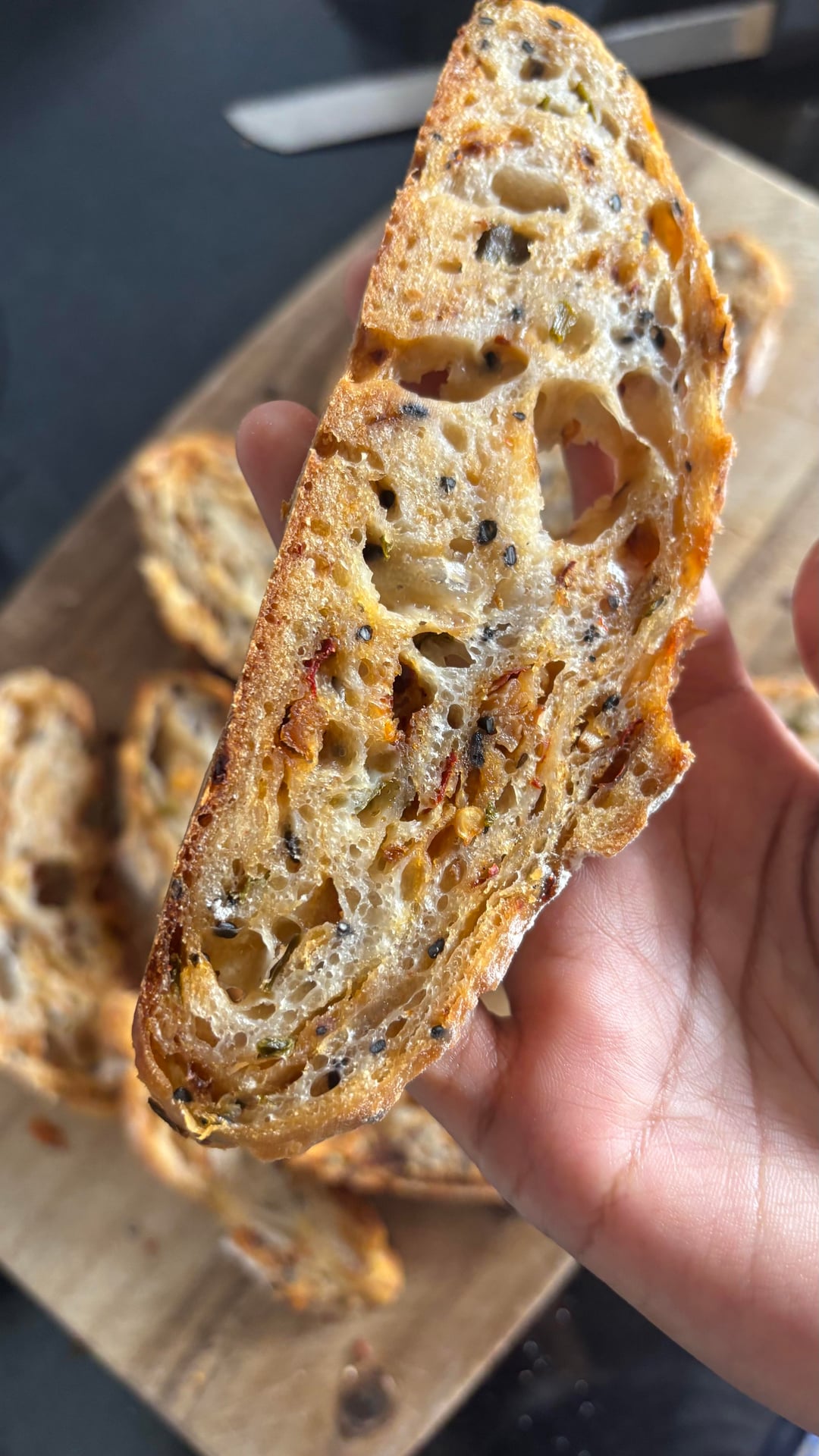 This was the last chili oil loaf I did at roughly 70-ish percent hydration give or take the 30 or so grams of chili oil I swirled in. Only had one small pocket where the oil was too concentrated in one area but otherwise it came out flavored well without disruptioning the crumb.