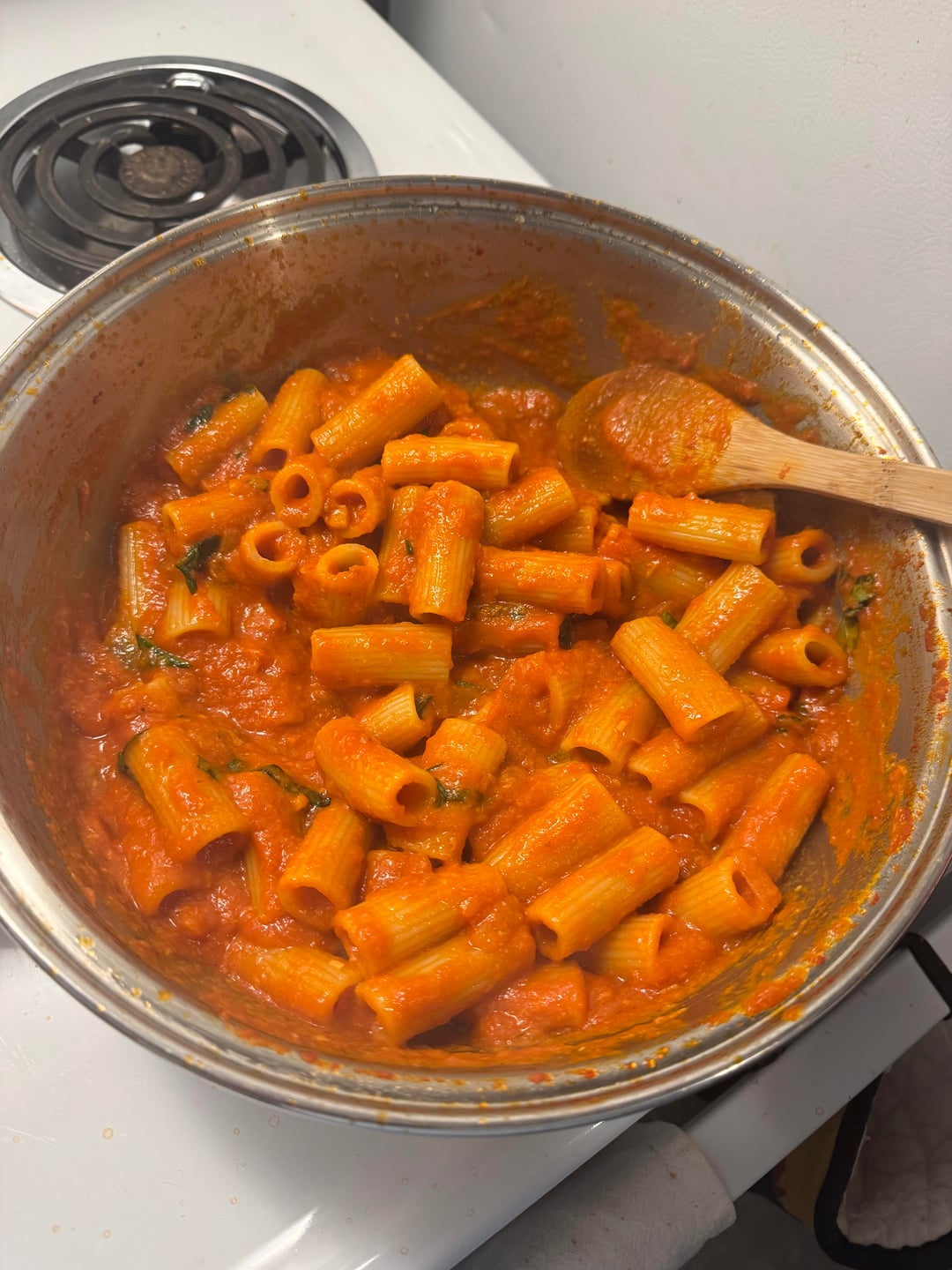 I bought rigatoni and wasn’t sure what to do with it, so I came across this recipe and went for it. Really good! Tomato heavy so pepcid may be necessary. Which, is it true if you add baking soda to your tomato dish, it will help the acid without messing with the flavor?