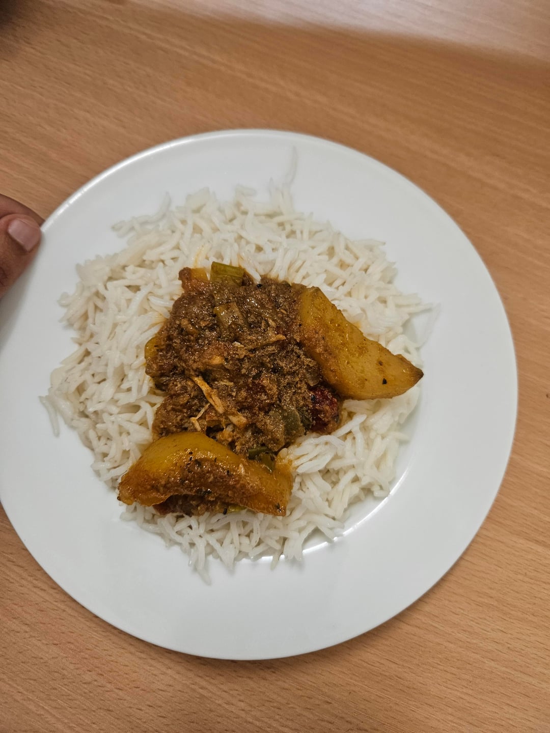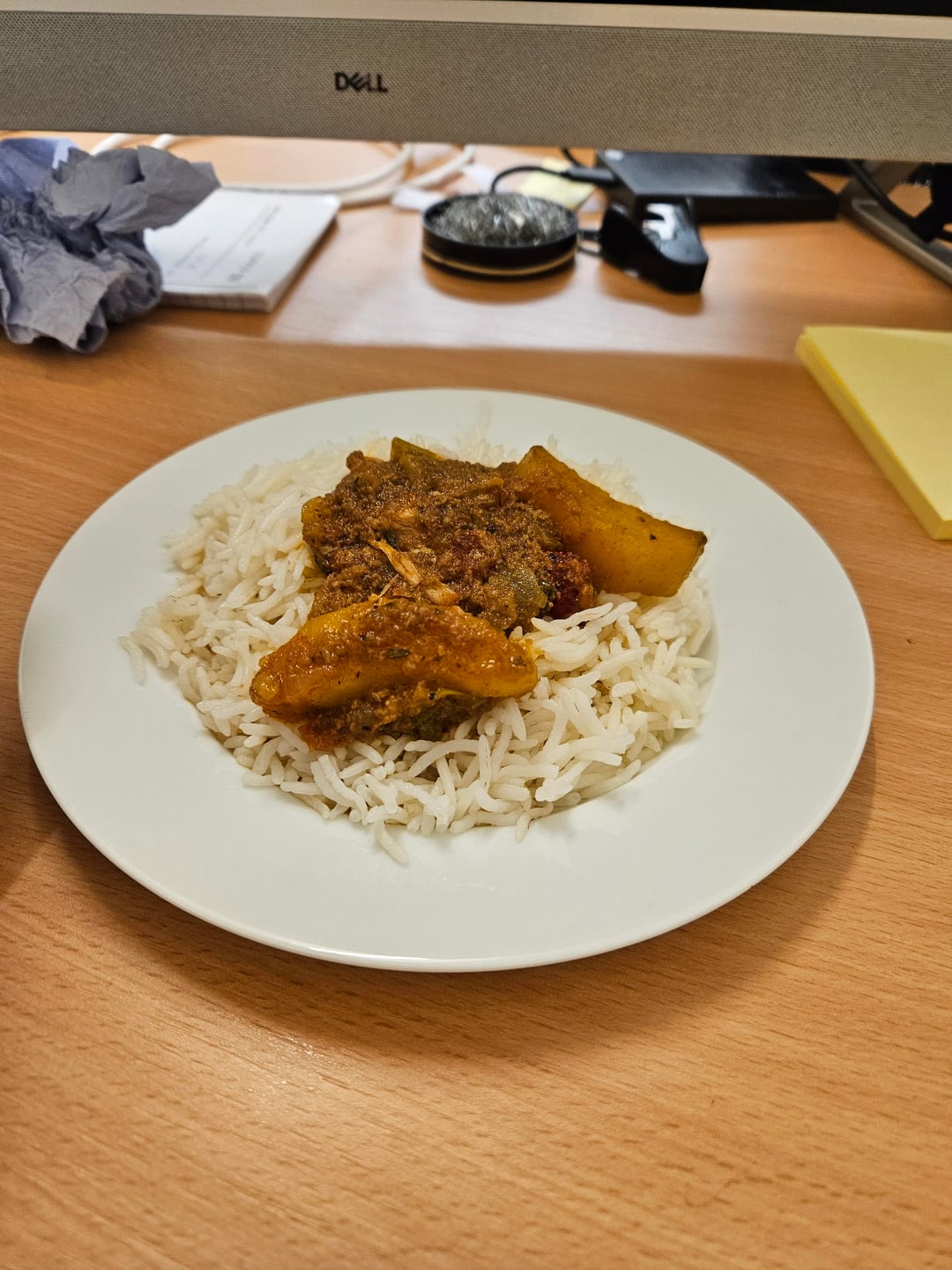 Had this at office today. Its a quarter plate. Some white rice with the curry of a chicken curry (i avoid meat when I can) with two pieces of potato.