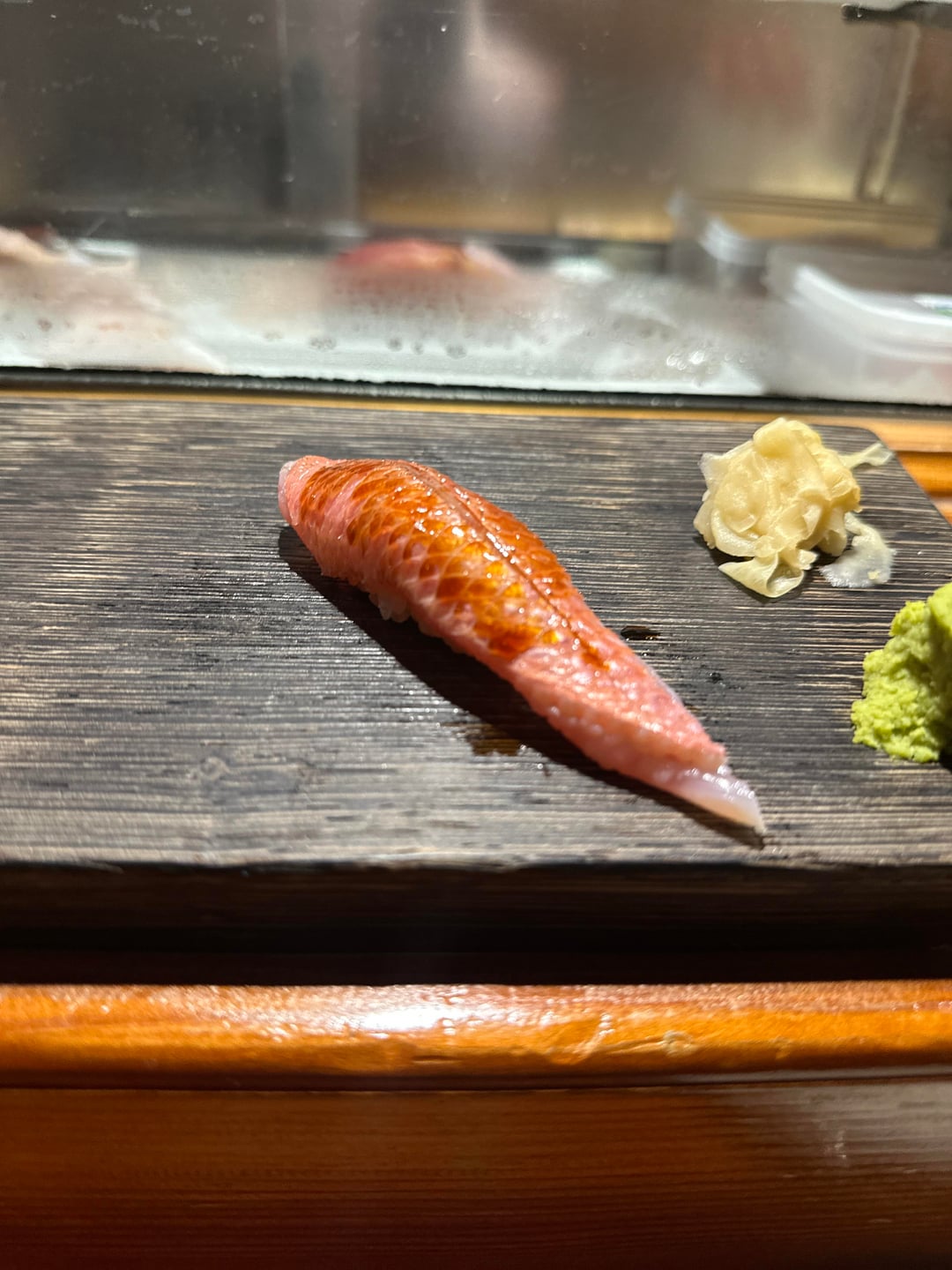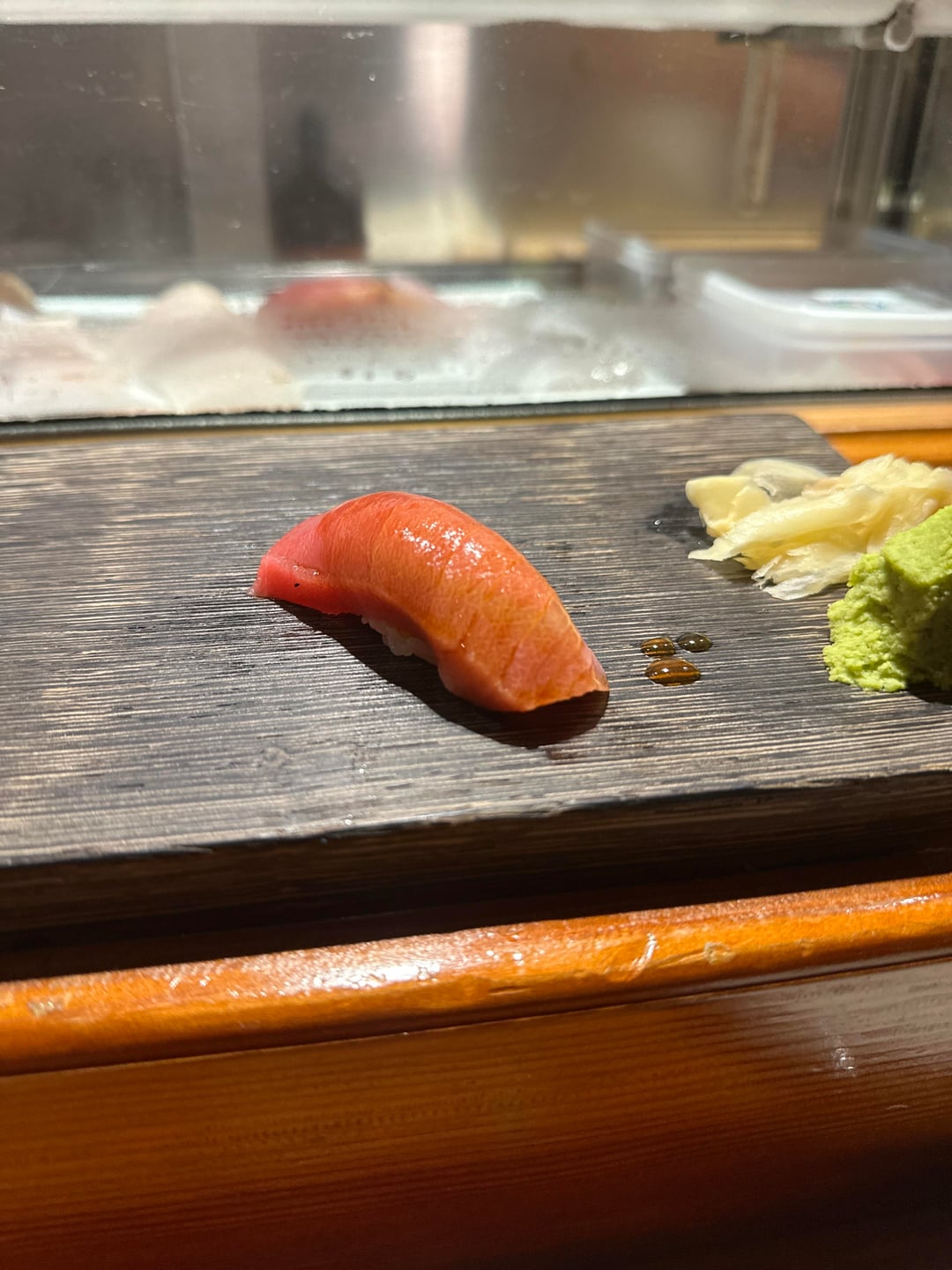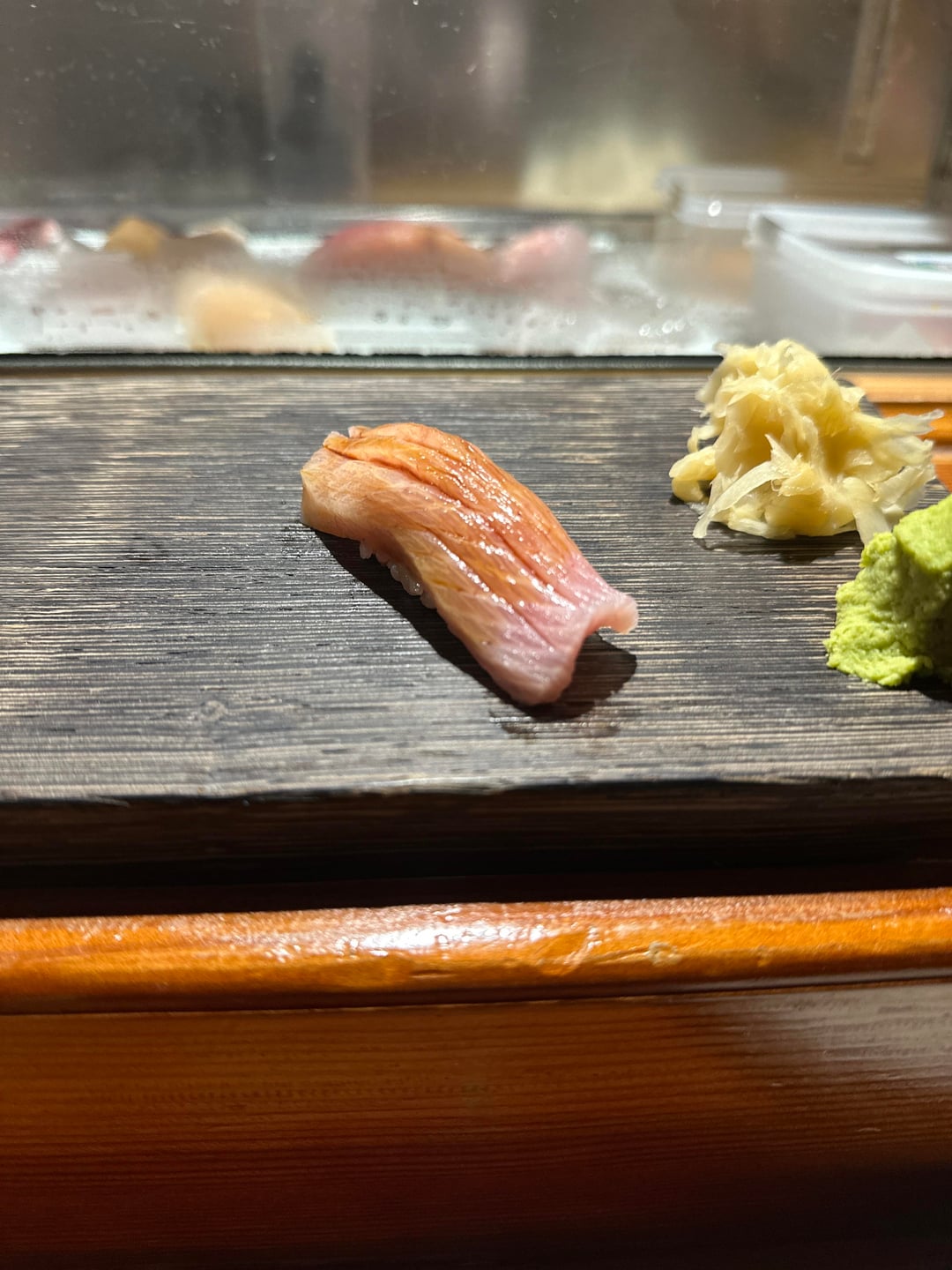 6. Akami zuke, less fatty than winter tuna usually is – a really pleasant meaty tasty on the finish that was actually pretty good with the slight nikiri up top