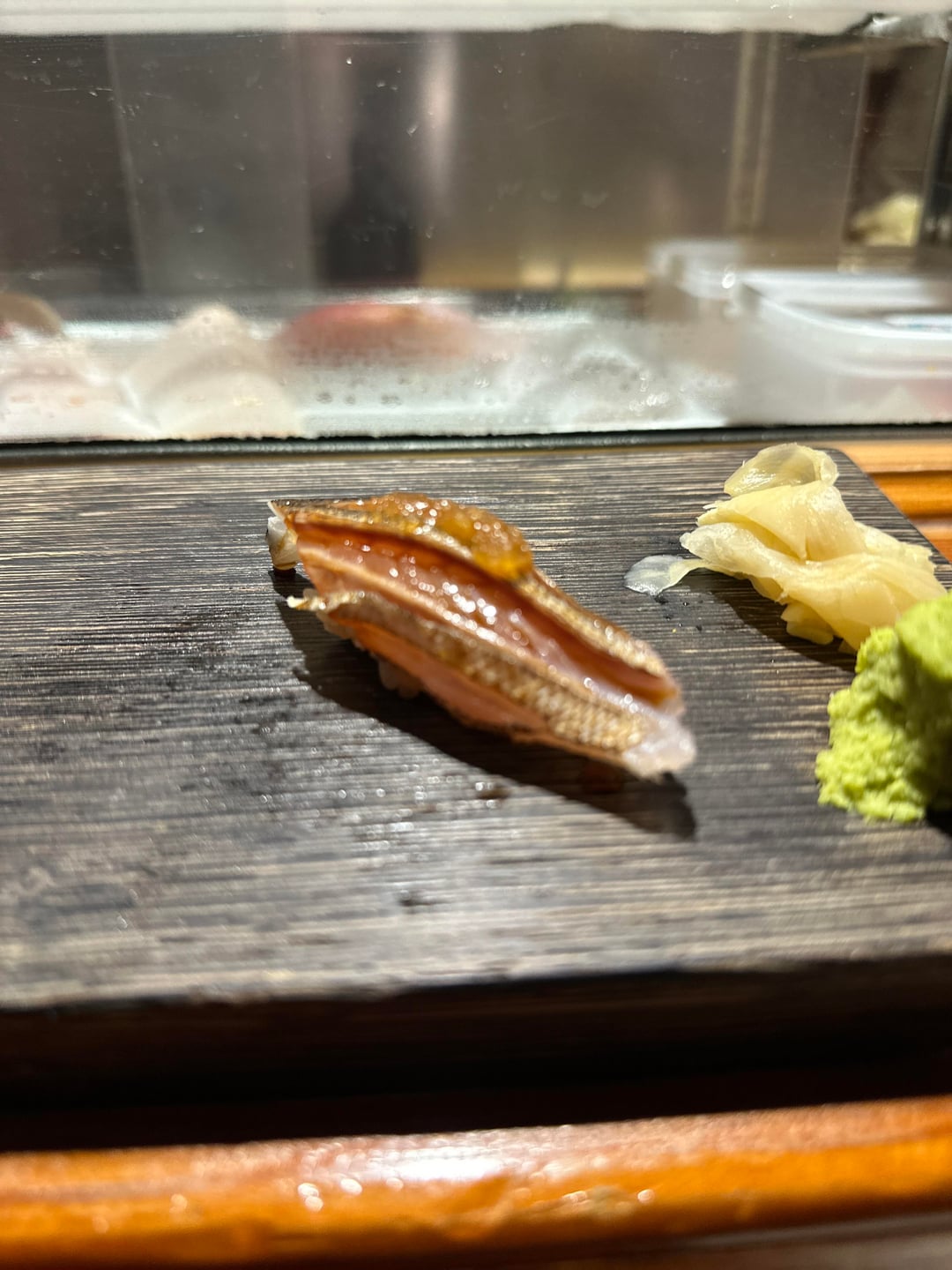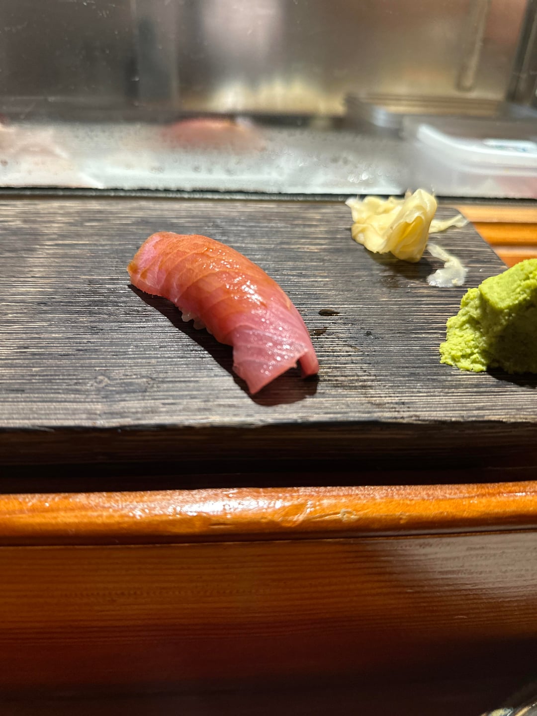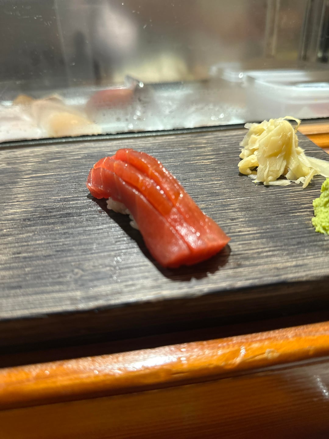 6. Akami zuke, less fatty than winter tuna usually is – a really pleasant meaty tasty on the finish that was actually pretty good with the slight nikiri up top