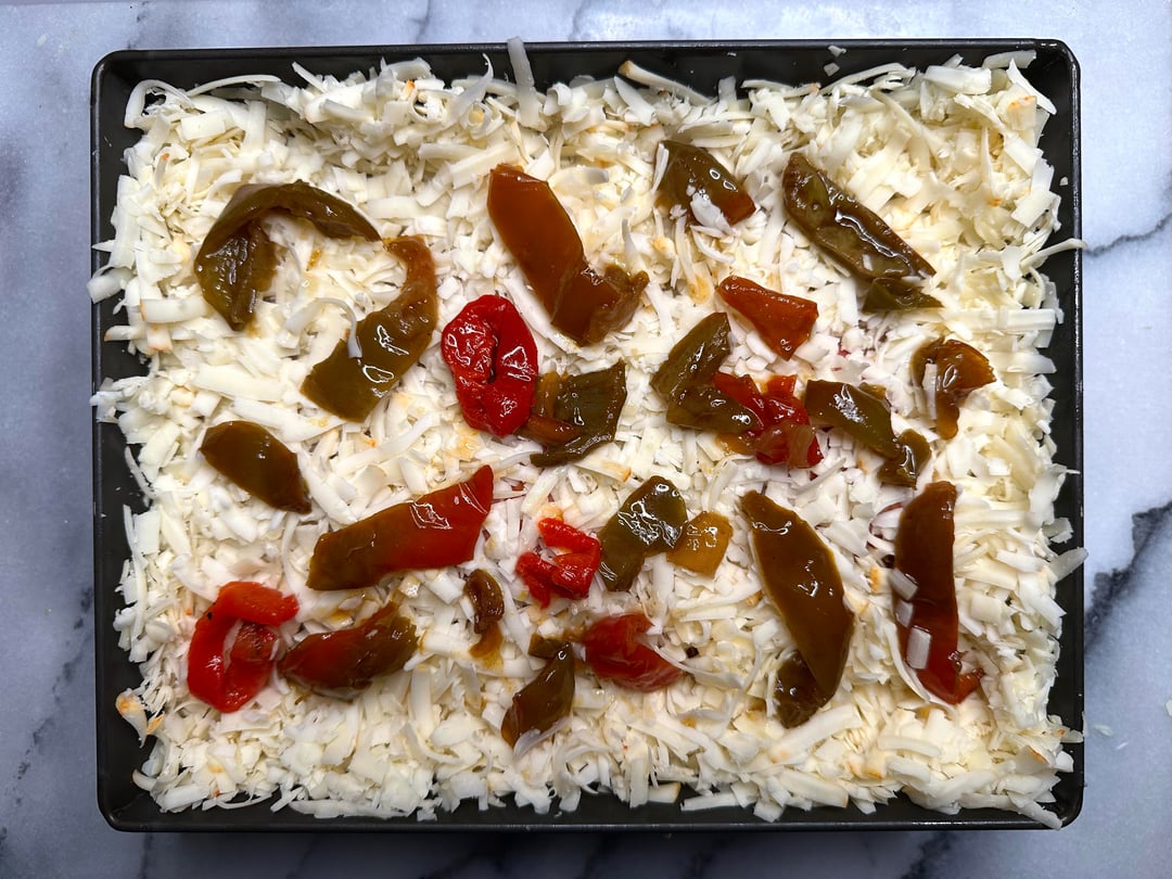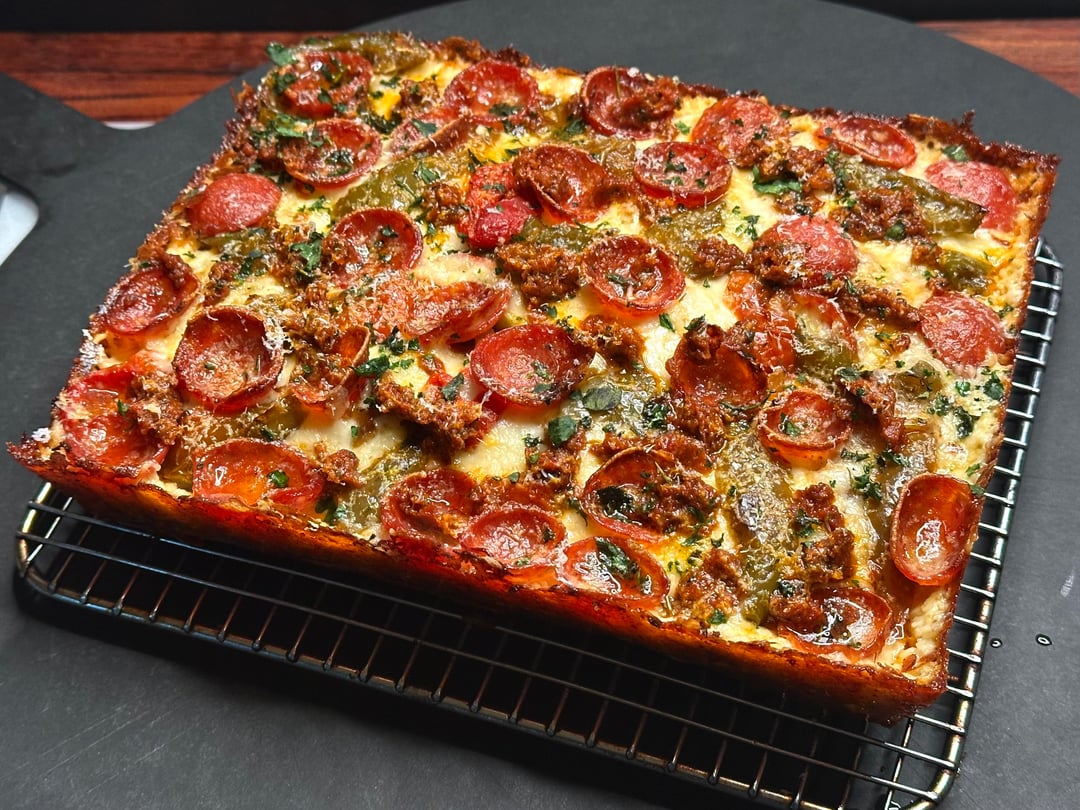 Pizza night! This week’s special was another Detroit-style (on a par baked base) with Muenster and sharp cheddar mix. Topped with cupping pepperoni, and pan-fried bell peppers. Out of the oven I added some red pesto, dried herbs, and freshly grated Cotija cheese.