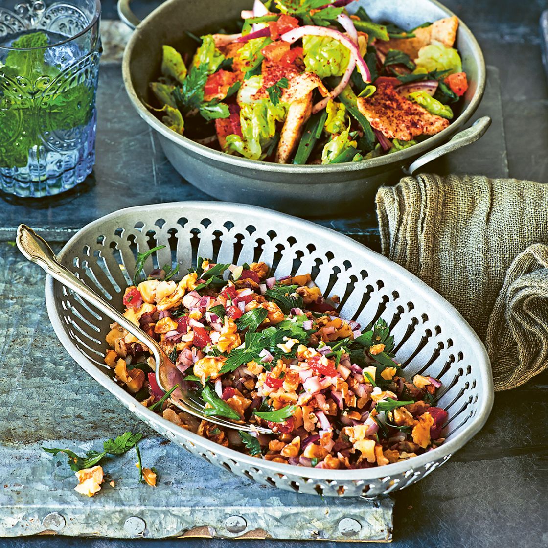 Also featuring a spicy kick, Ghillie’s walnut, parsley and chilli salad takes its inspiration from Kurdish cuisine. The hearty salad is packed with crunchy walnuts, simply accompanied by parsley, chillies, tomatoes and more pomegranate molasses for a dinner that will be ready in minutes.