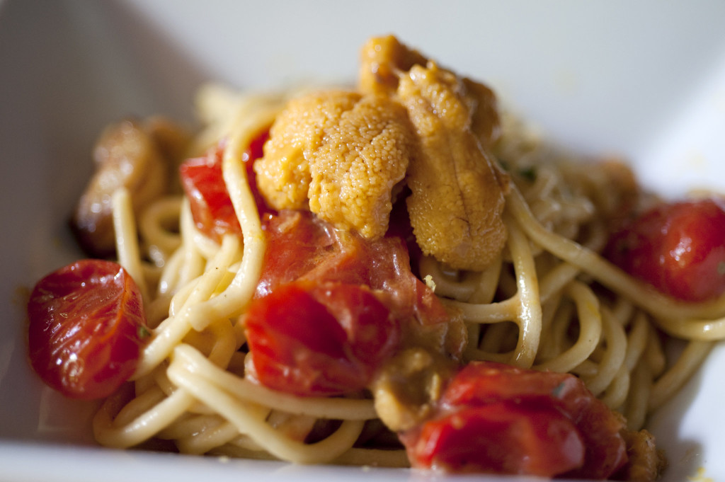 - Turn heat under skillet to low. Add about 3/4 of the sea urchin to skillet with a sprinkle of salt and a splash of pasta cooking water. Add pasta to skillet and toss thoroughly but gently over low heat, adding pasta cooking water and more oil to taste if mixture is dry. Taste for salt and toss in lemon zest, if using, and parsley. Serve hot, decorating each serving with remaining sea urchin.