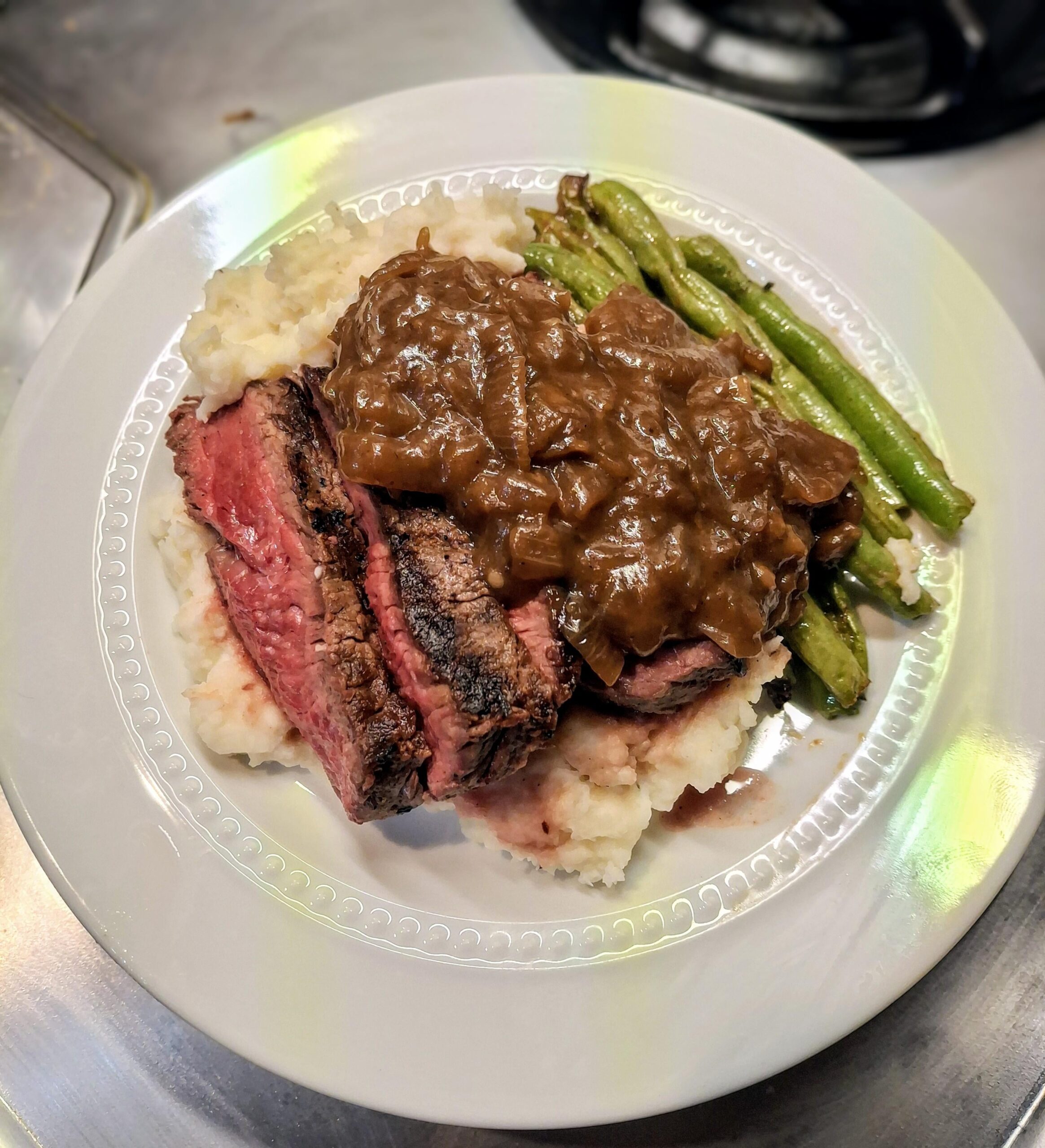 **[OC]** French Onion Gravy over Flank Steak, Mashed Potatoes, and Green Beans by chikinbizkit 2 Comments PeaceLoveSmithWesson 5 days ago Is this **[OC]** ? cherrycokelemon 5 days ago This looks absolutely wonderful!
