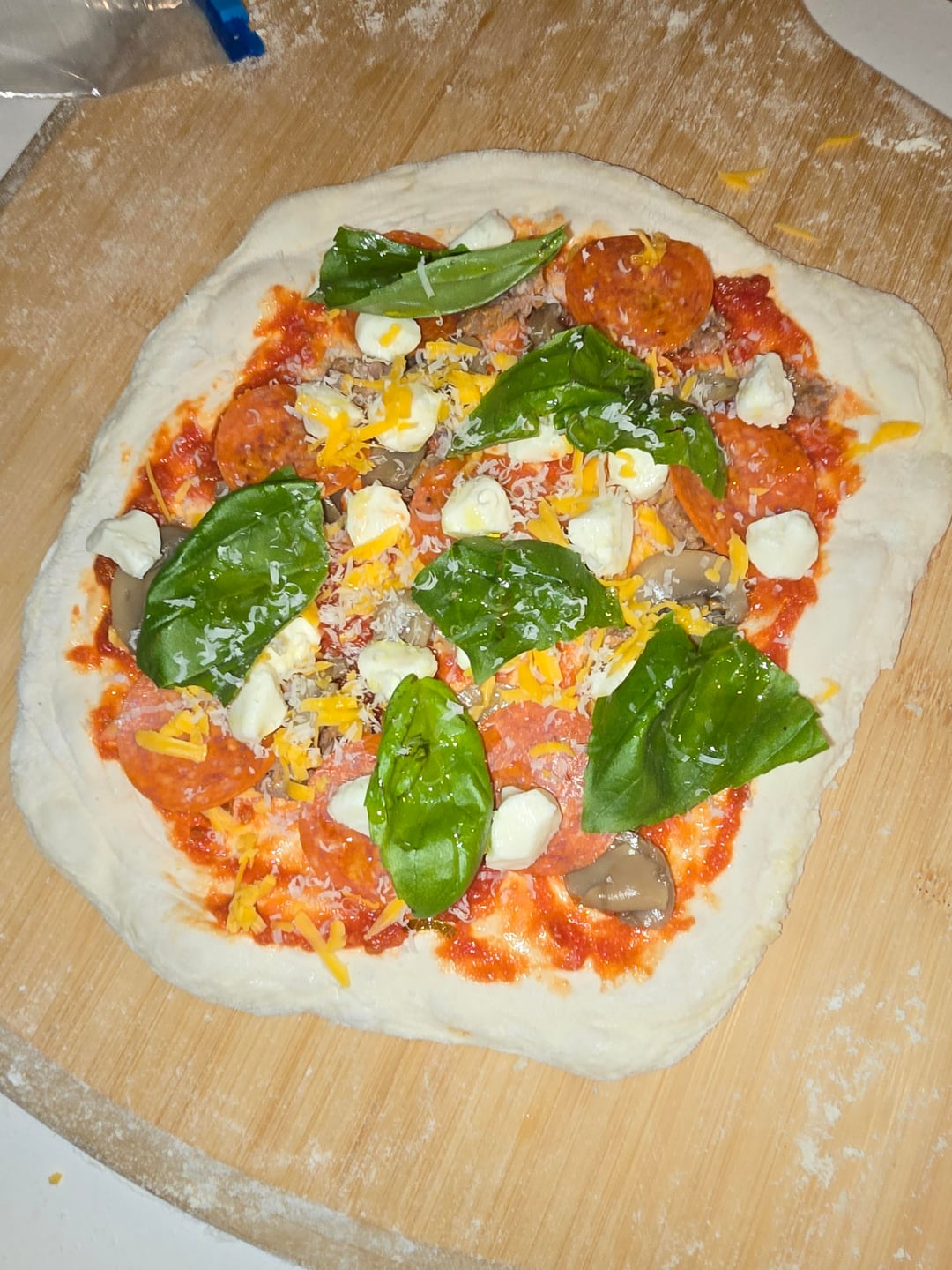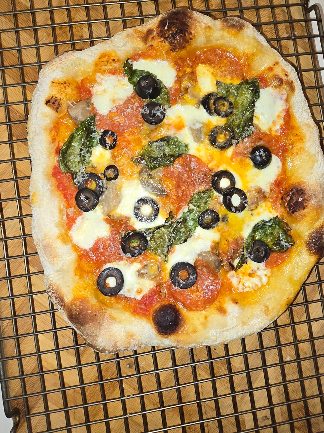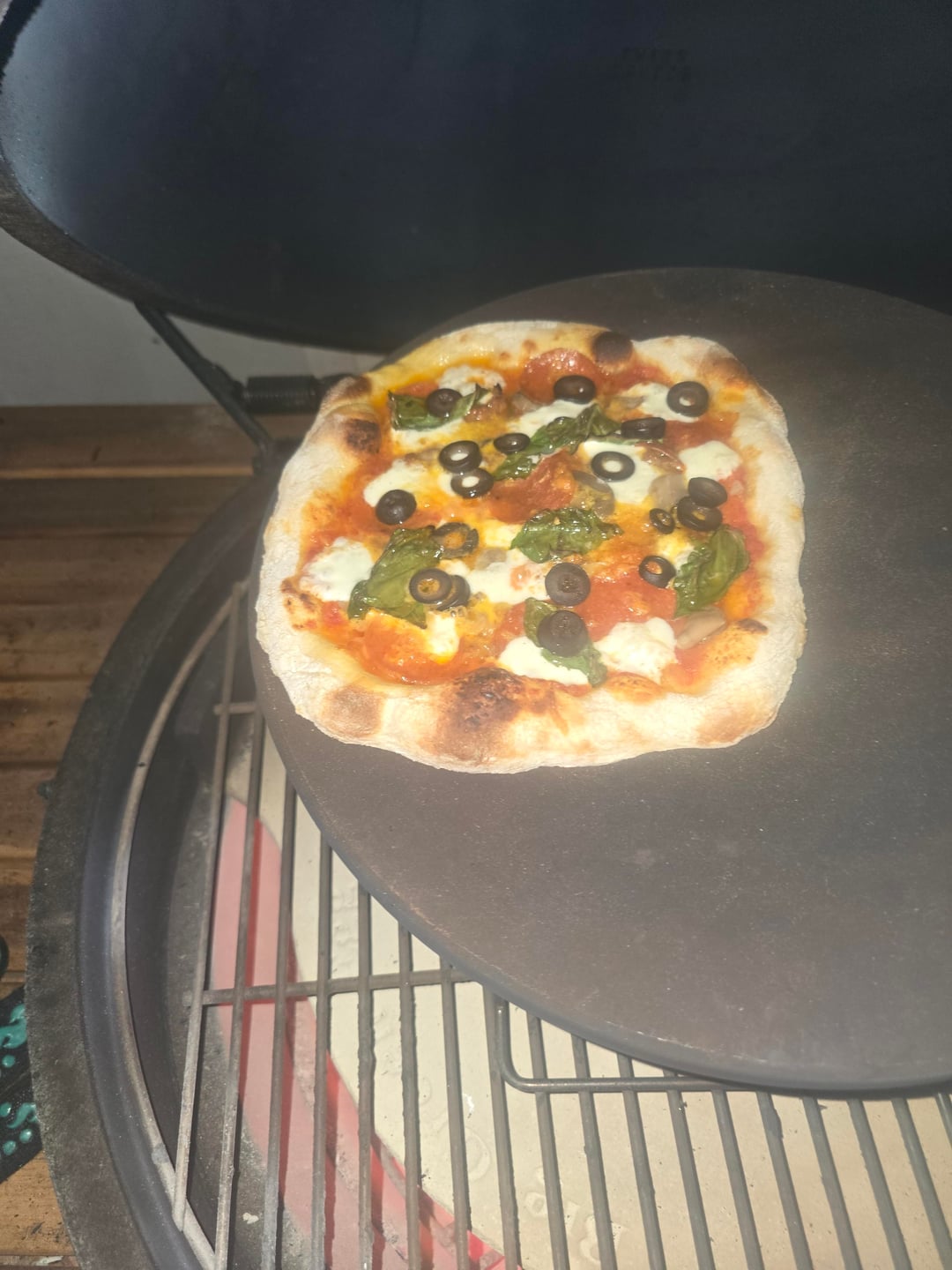 For got to add the olives till after I had it on. The them on top during the cook. Sour dough crust at 70% hydration. Just using a basic sour dough bread recipe for the crust. Turned out great. by _HeyBob 2 Comments LopsidedAlbatross703 9 hours ago Looks great. I’m going to try that on my grill Slimmdunkin 9 hours ago What set up for your fire?