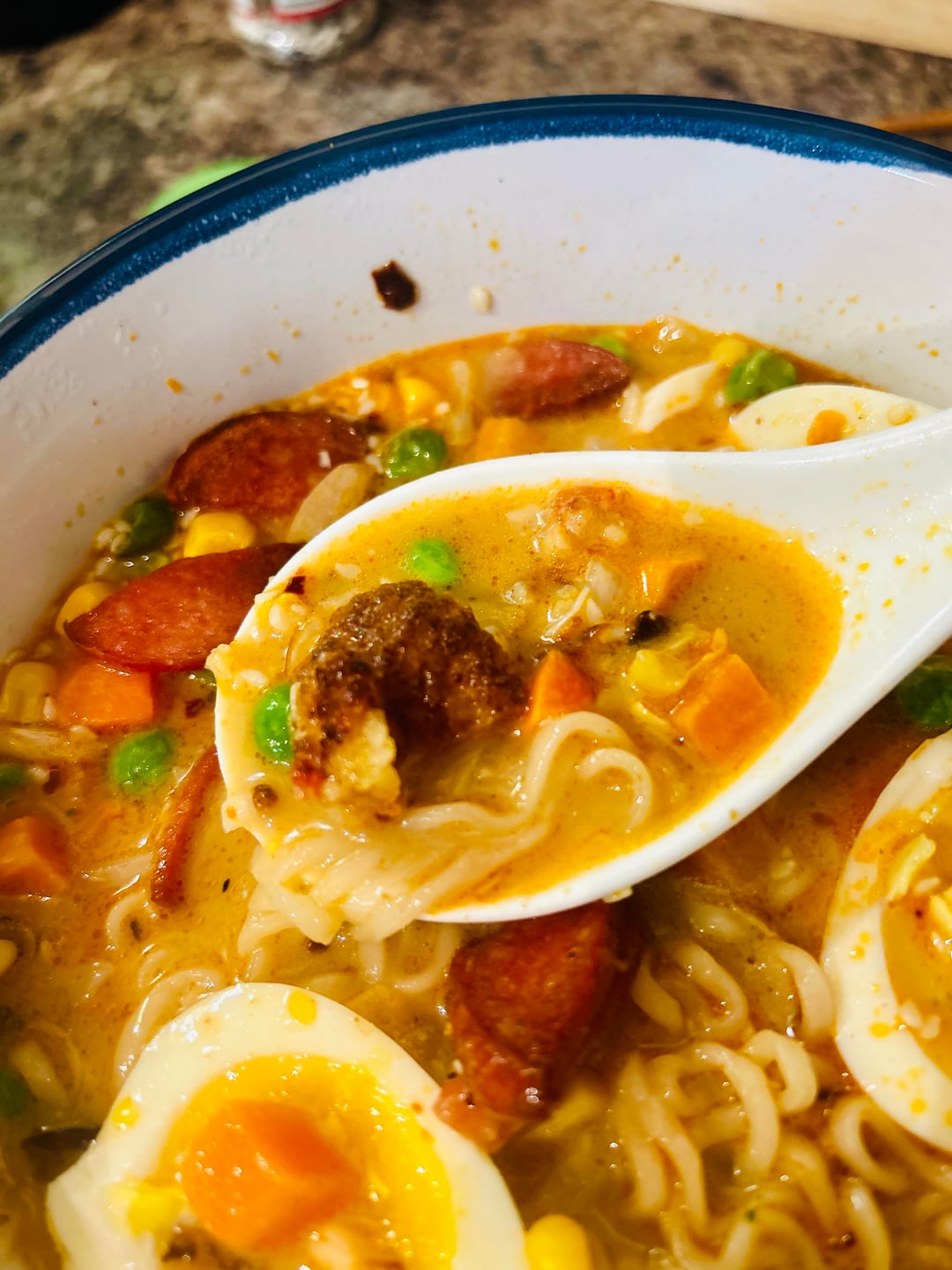 FYI I air fried crispy crabcakes and garlic sausage with onions and half way thru cooking I mixed in some frozen veg melody. while that was cooking, I soft boiled eggs for six minutes then cooled in cold water, then made ichiban tonkotsu ramen. On the side I mixed chili oil, soya sauce, small amount of rice wine vinegar, siracha, and a splash of cream, when all the gumbo ingredients were ready, I poured the ichiban soup into bowl of the creamy mixture, and topped with eggs, crispy air fried mix of seafood sausage and veg. Sprinkle sesame seeds and add seasonings to taste. Soooooo good!