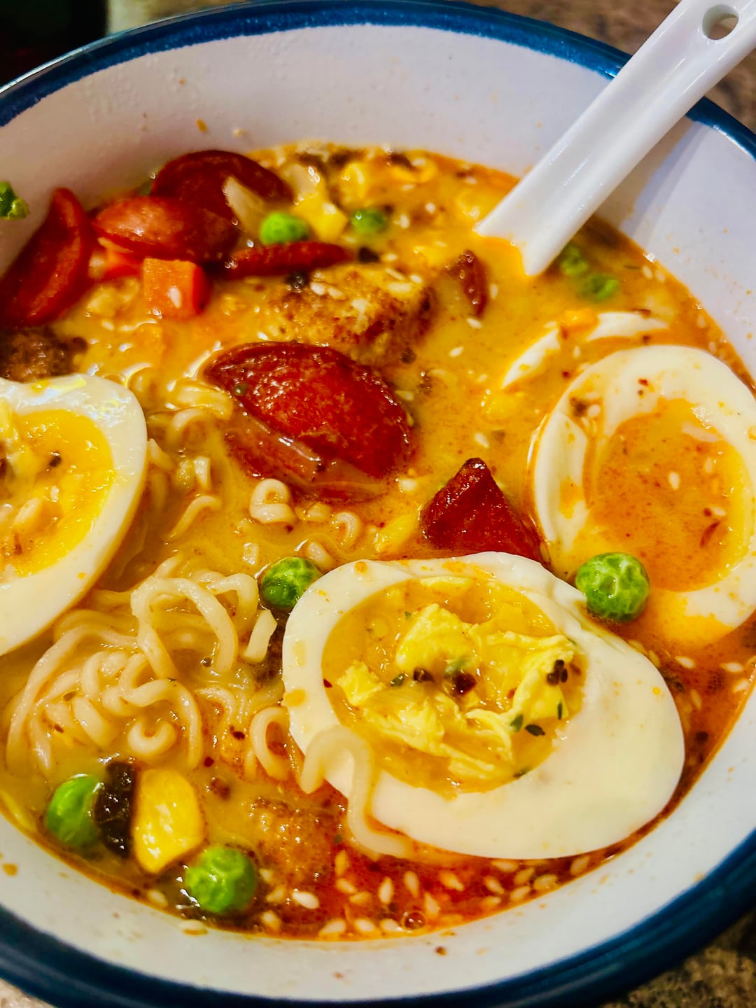 So I didn’t wanna go to the store, normally I make my ramen with broccoli and bok choy at the very least but I was tired. I decided anyways that I would try to make a Ramen, as per usual. I scoured my kitchen, pretending I was on chopped, and created this masterpiece. 😍🤤🍜