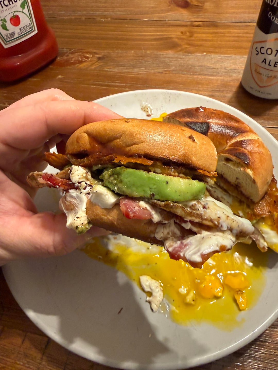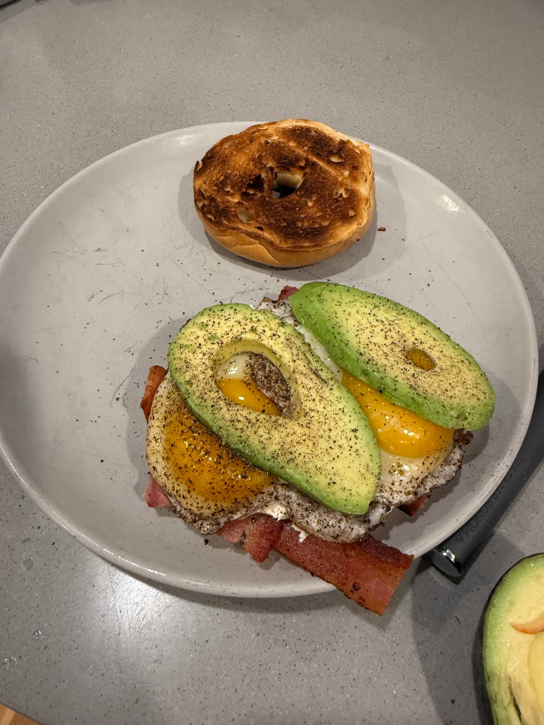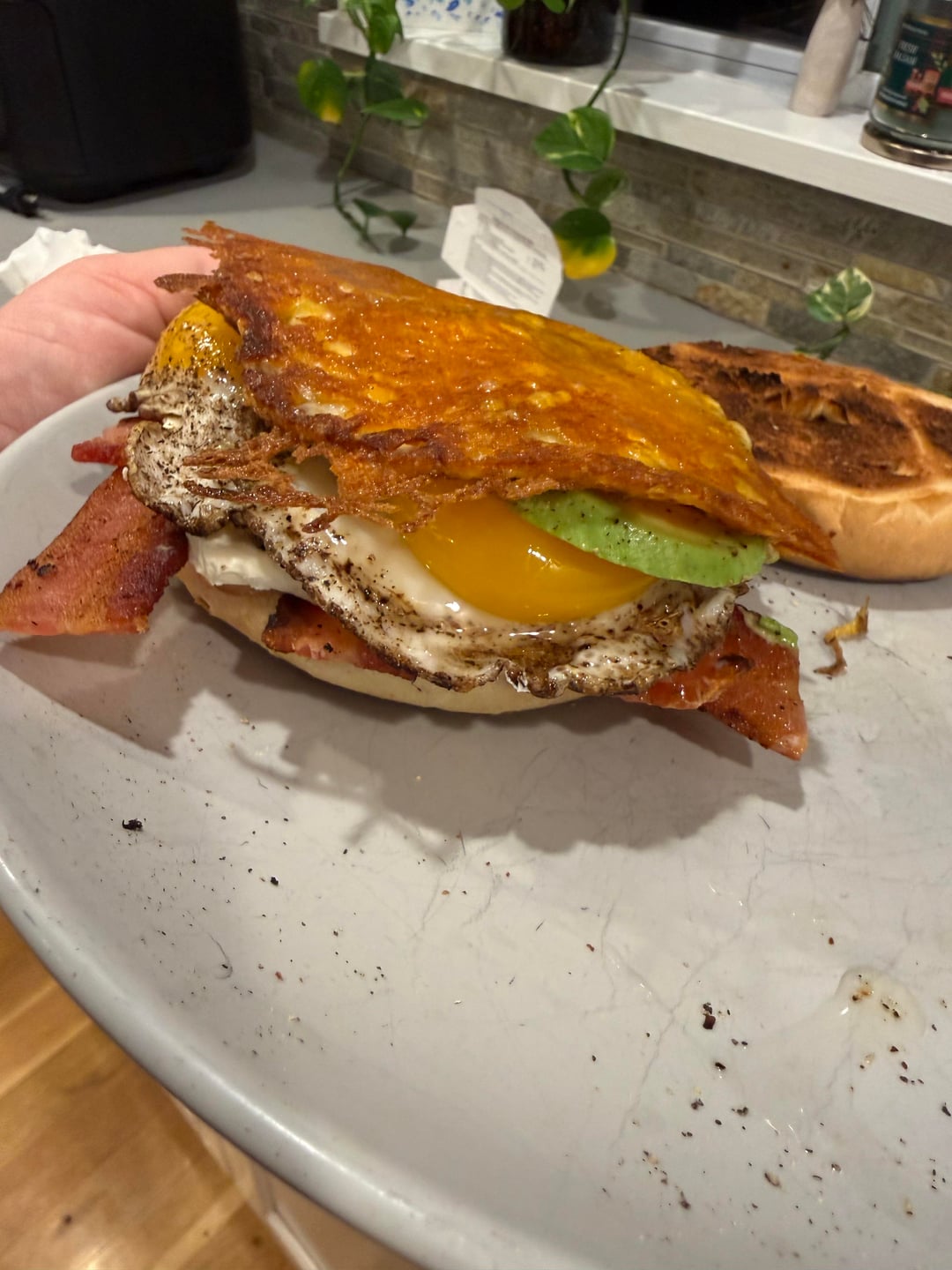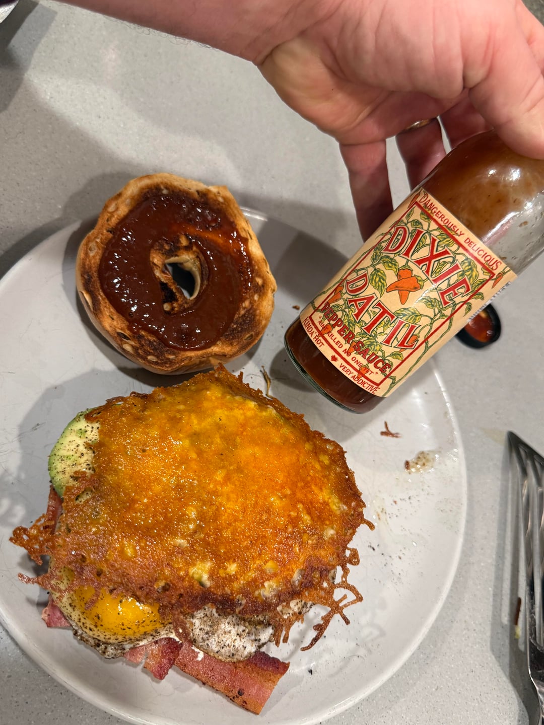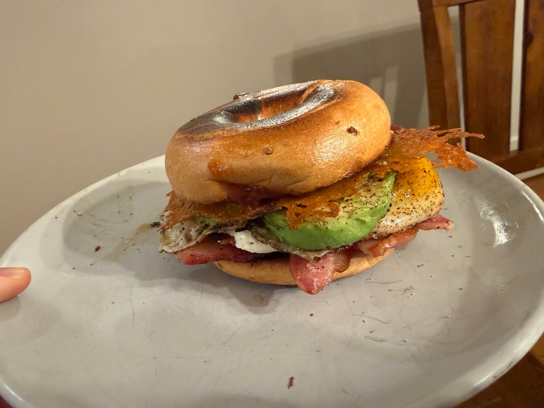 – Onion Bagel– Bacon (Wright Applewood – first time using, awesome.)– Cream Cheese– Sunny Side Up x 2– Avocado– Melted Provolone + Mexican Cheese– Dixie Patil Pepper Sauce (Thanks Dad!)by mrfixerdudemanguy 33 Comments The-Master-of-DeTox 1 month ago You might want to cook your eggs though. Slower and lower my friend! Independent-East6312 1 month ago She’s gorgeous Skatchbro 1 month ago My cardiologist is now mad at you. My tastebuds are envious. OrangeClyde 1 month ago Great aside from those raw ass eggs SpankedbySpacs 1 month ago This bagel is 🤤 claremontmiller 1 month ago Oh that was a clusterfuck to eat and I’m *here for it* UnluckyMode2062 1 month ago Needs more black pepper Noa-Guey 1 month ago Looks good. Bagel kinda burnt, but everyone has their preferences. What Mexican cheese? Mexico makes dozens of different kinds. (Hola desde Mexico.) Zealousideal-Cup5982 1 month ago Those eggs never stood a chance ChiefRedChild 1 month ago You had me like ninjabell 1 month ago Dayum, that is one feast of a bagel lurking_terror--- 1 month ago That datil sauce looks great too. love those damn peppers aruggie2 1 month ago Bro you made art and are asking us if it’s allowed. Of course it is! Romish1983 1 month ago  TryBananna4Scale 1 month ago I give like for using woven bacon technique. Good in my book ! 👍🏽 Homie_Slicer 1 month ago Looks really good, but the way you cut that avocado is bothering me lol. Kamikoozy 1 month ago No until I saw your hot sauce. Respect 🔥 BeNiceLynnie 1 month ago The bacon lattice is so unnecessary and I respect your game Nuts-And-Volts 1 month ago I will allow it due to lattice bacon weave cambomusic 1 month ago Yes but just not yours! JKJK that looks fvcking delicious Impressive_Ice6970 1 month ago Bagels are delicious sandwich material! tpkadam 1 month ago Love bacon lattice NopeRope13 1 month ago Now deep fry it and add maple syrup Winter_Addition 1 month ago This looks delicious but you’re a psycho for putting the cream cheese in the middle 😂 I say this with love. Guataguano 1 month ago This is well done! GringosTaqueria 1 month ago I’ll say it…yeah…putting that much black pepper on eggs should be illegal. There. I said it. MyAssPancake 1 month ago Sure, it’s a bagel sandwich! And it looks…… incredible to say the least Worth_Ad4258 1 month ago Bagel sandwiches are the best! Thank you for sharing this! adube440 1 month ago Now THAT’S my kind of everything bagel. Mizzzmurphdizzle 1 month ago I’m here for the bacon lattice and cheese skirt! Looks amazing OP! yonderoy 1 month ago Damn, daddy 🥵 vaporgaze2006 1 month ago  GooseGeuce 1 month ago I made some sort of involuntary noise of approval, sort of a grunt/sigh/palpitation when I got to the slab of cooked cheese. Bravo