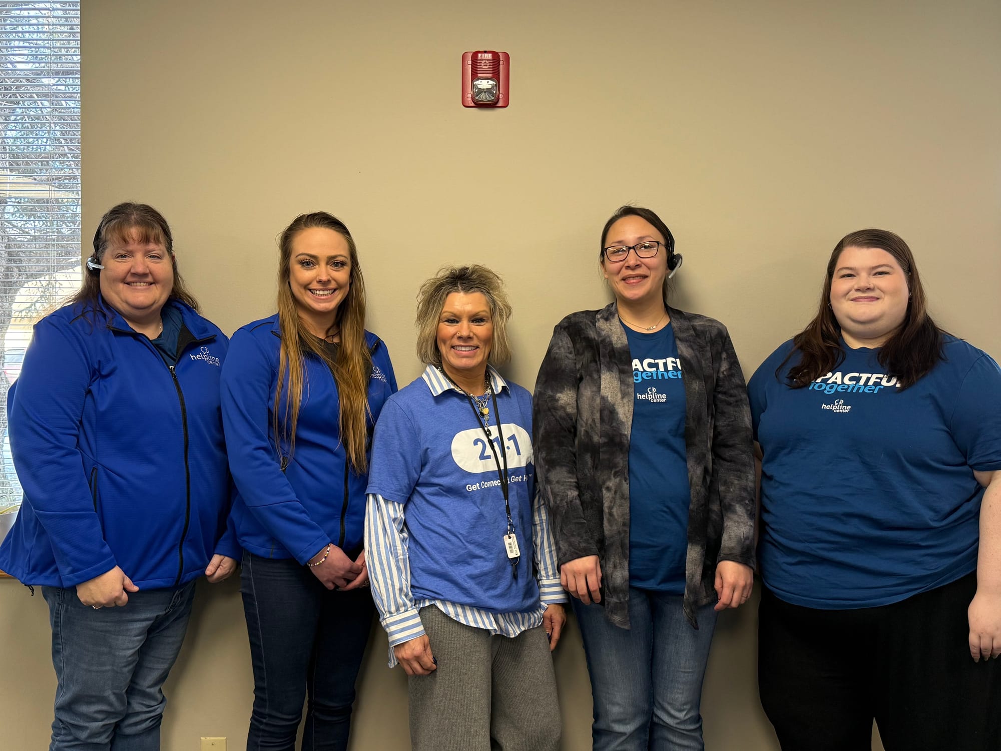 211 director Jamie Cody and 211 staffers at the Helpline Center in Sioux Falls, S.D. L-R Jenny Beauchan, Kylee Wilmarth, Jamie Cody, Jessica and Hannah West on Jan. 30, 2026. (Photo: Molly Wetsch/South Dakota News Watch)