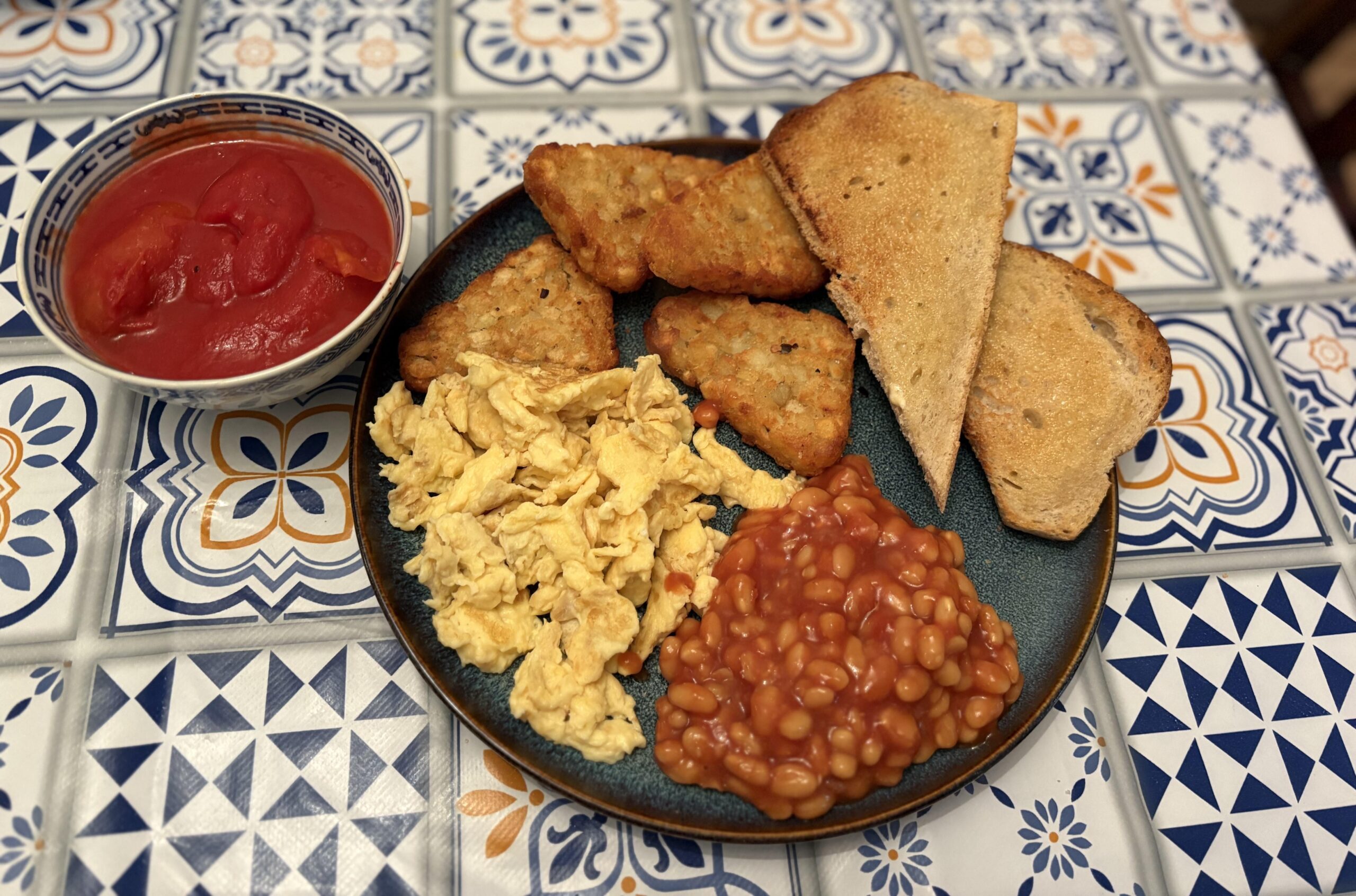 no pork products as i’m vegetarian. i’ve got veggie sausage in the freezer but didn’t fancy it. tomato in the bowl as too much “wet” stuff on one plate otherwise with the beans/egg.white sourdough bread and McCains hash browns.by ForestFairy77 Dining and Cooking